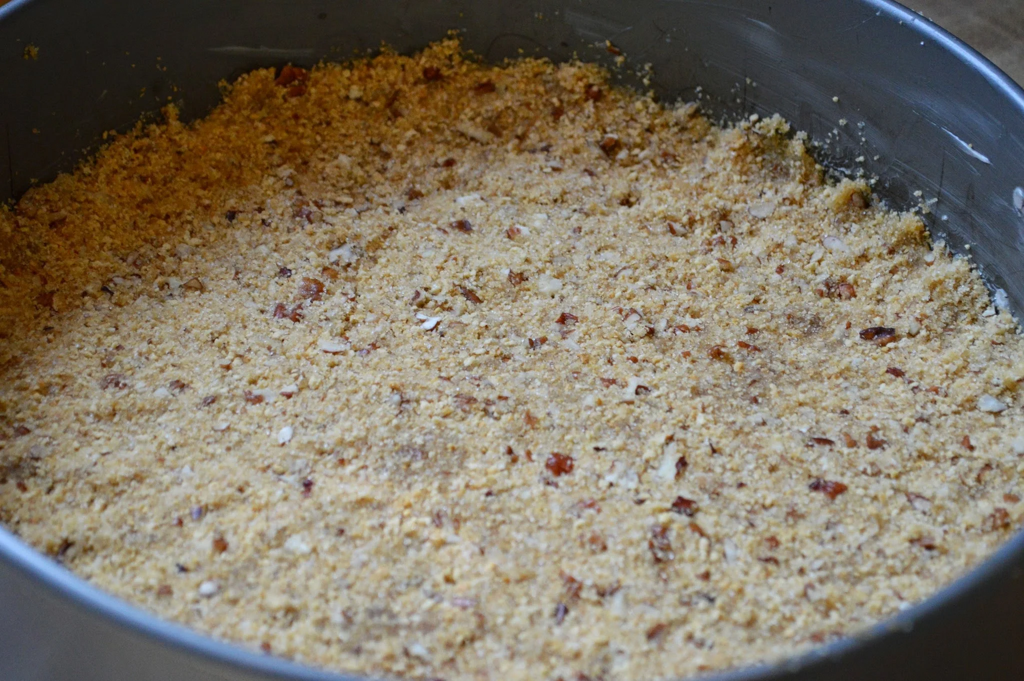 1. To make the crust: Take a 9 inch springform pan and invert the removable bottom and lock into place. This helps to create a flat bottom which makes it easier to remove the cake from the pan. Then butter the pan well.