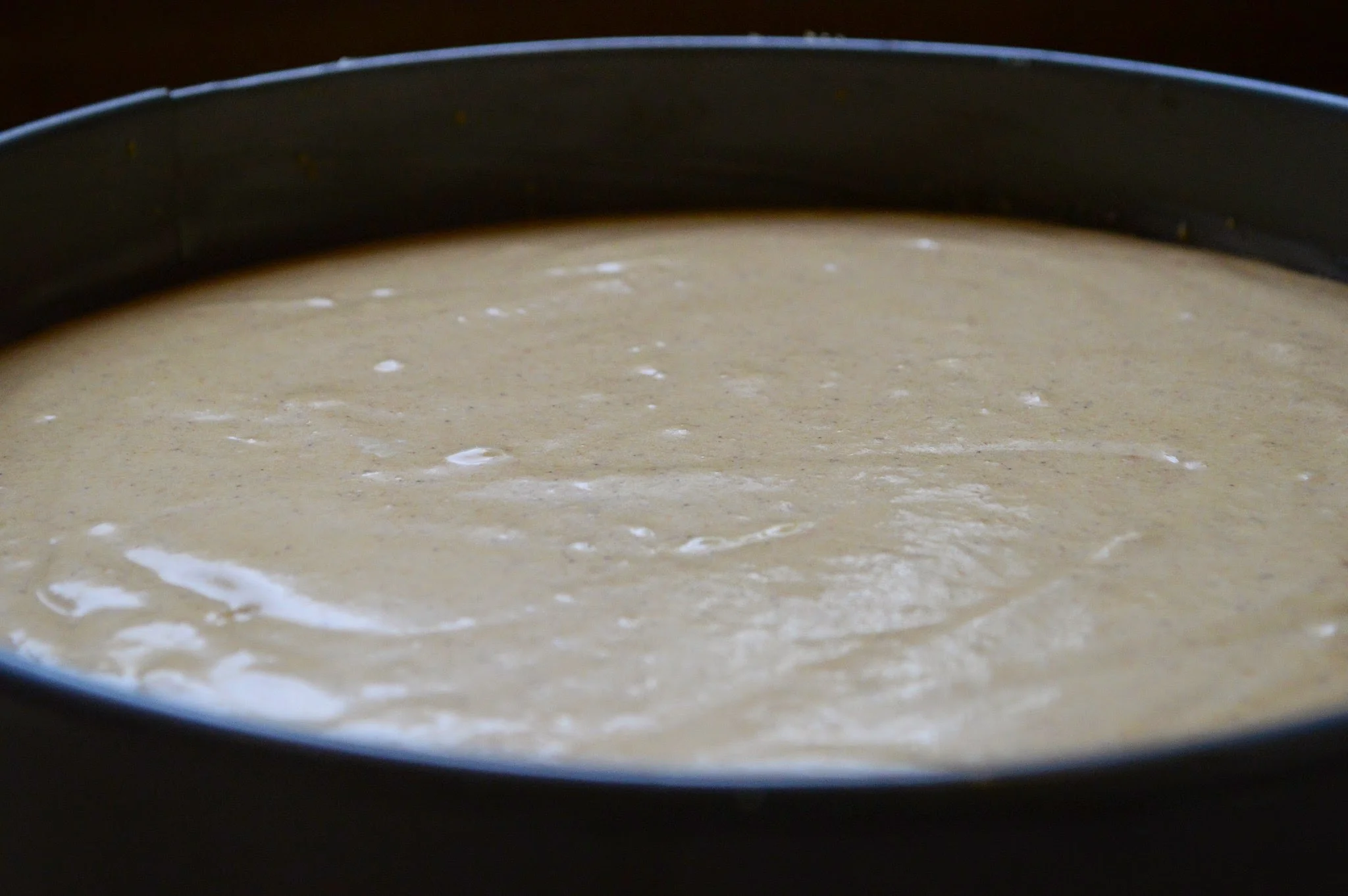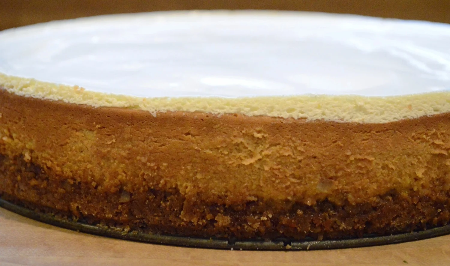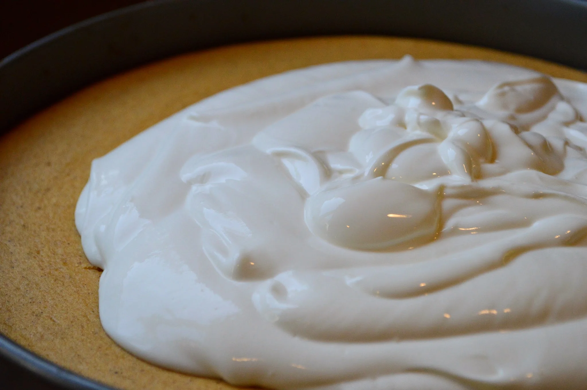 Next you bake it (doesn't even need a water bath) and once it comes out of the oven you slather it with a divine sour cream/sugar mixture and return it to the oven to bake just for a few more minutes so that the topping is barely set--