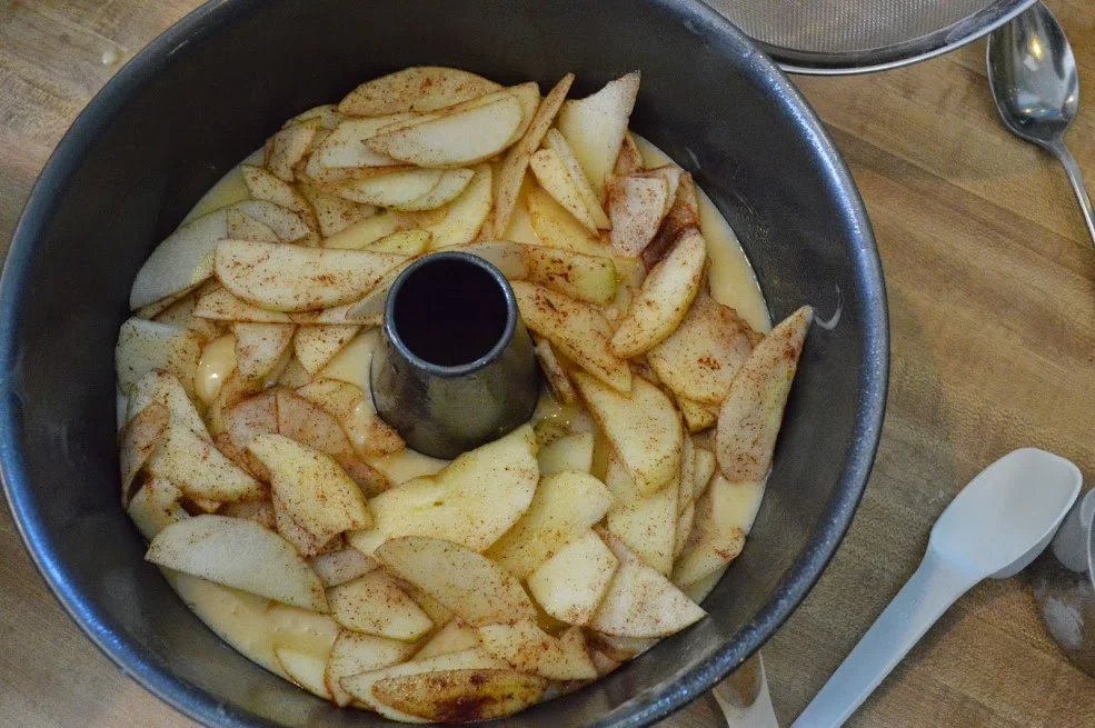 Think apples, cinnamon and poundcake all wrapped up together. Till last week, I hadn't made it in years and now I'm kicking myself for it! It's so homey and so easy--and charmingly old-fashioned. There's nothing fancy about it, which is refreshing if you're always looking at complicated pastry recipes, like me. Plus you get to use a tube pan for this, which doesn't happen that often but is a real treat ( know, I need to get out more). If the speed at which it disappeared among my family can be used as a yardstick for deliciousness, then this ranks high up there.