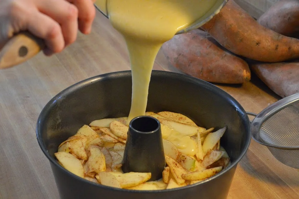 4. Using electric mixer, beat together sugar, oil, eggs, orange juice, and vanilla. On low speed, add flour mixture and mix well. Pour a layer of batter into tube pan and top with a layer of the apple mixture. Repeat, making several layers of batter and apples, finishing with apple layer on top.
