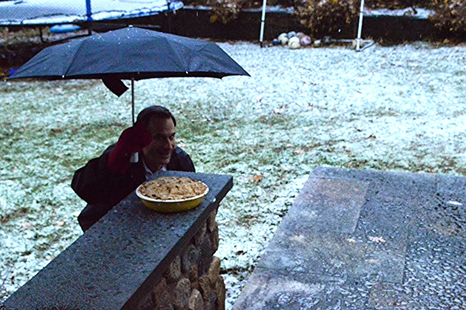 Yesterday, I made my pies--today it's The Best Cornbread (a double batch) plus Cranberry Maple Pudding Cake and then we're off to celebrate. Can't wait!! It's my favorite holiday and as always, I have so much to be thankful for, first and foremost, my amazing, devoted and goofy family who make my life fun, rewarding and meaningful every day! There are no lengths they won't go through on my behalf. Take for example, this photo of Apple Crumble Pie (I promise to post it next week) that my oldest (home from CA at last!!) staged with my husband to take advantage of the wintery landscape--