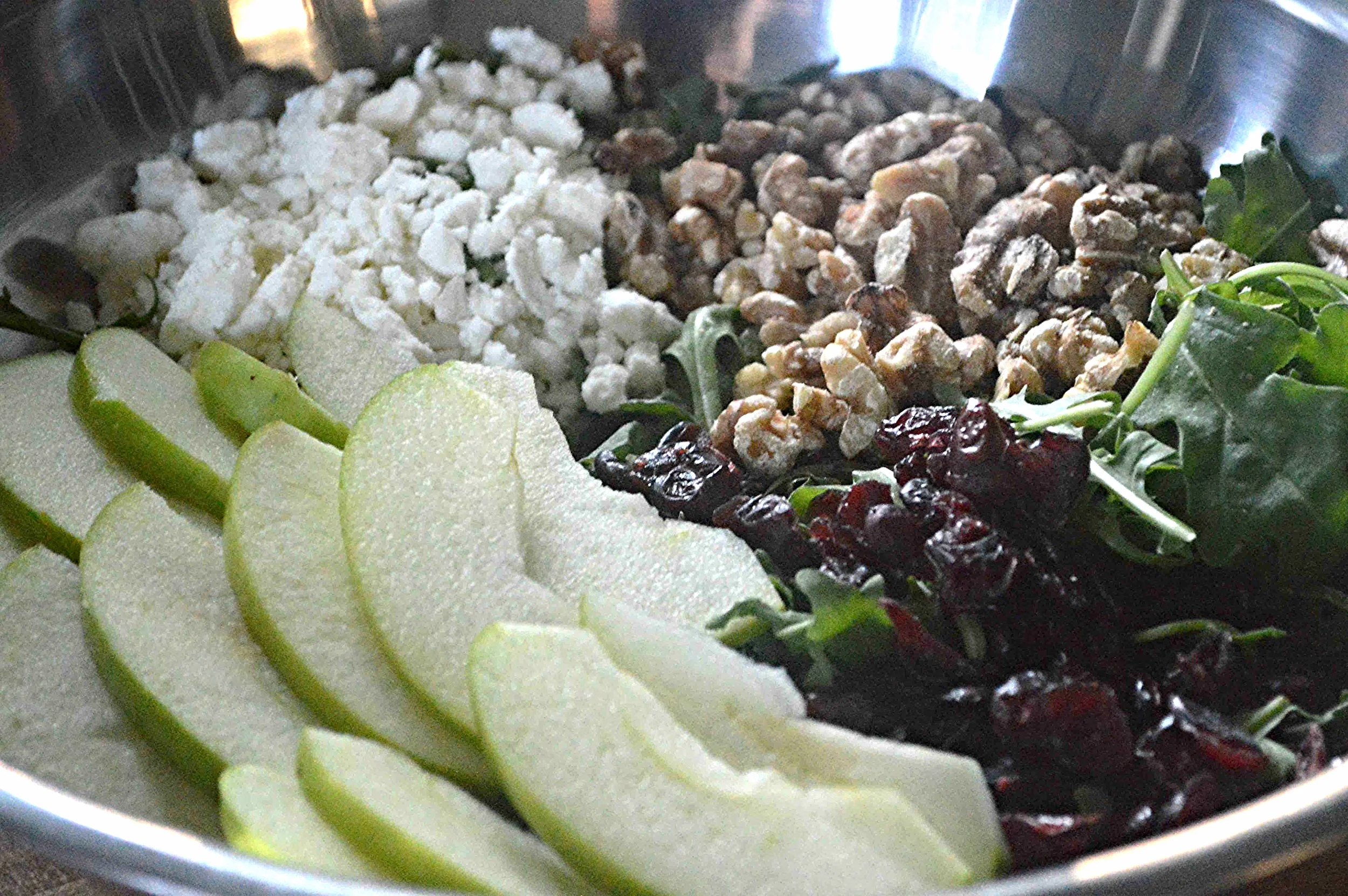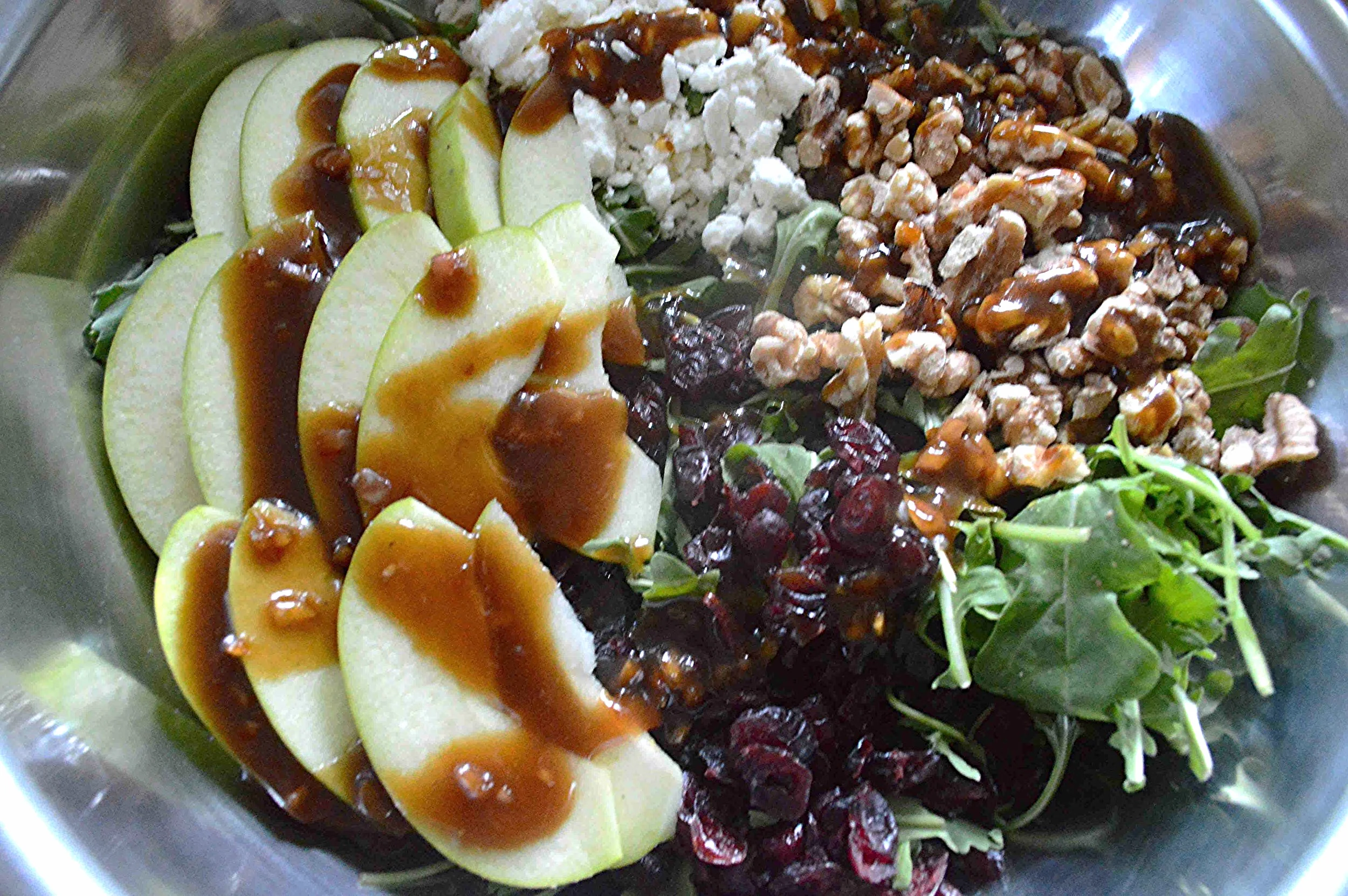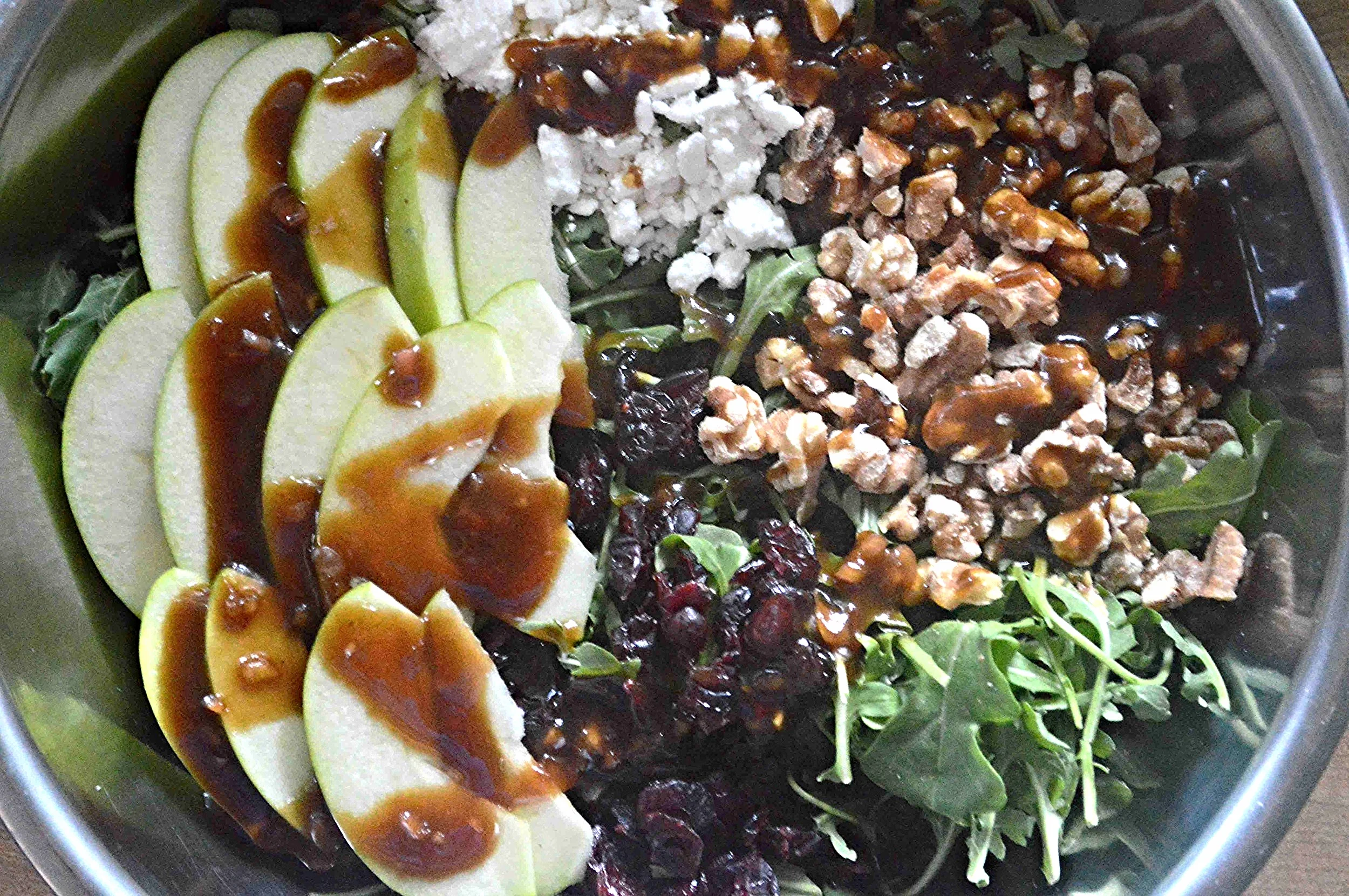 1. Into a large salad bowl, place the arugula, apple, cranberries, feta and walnuts. Set aside.