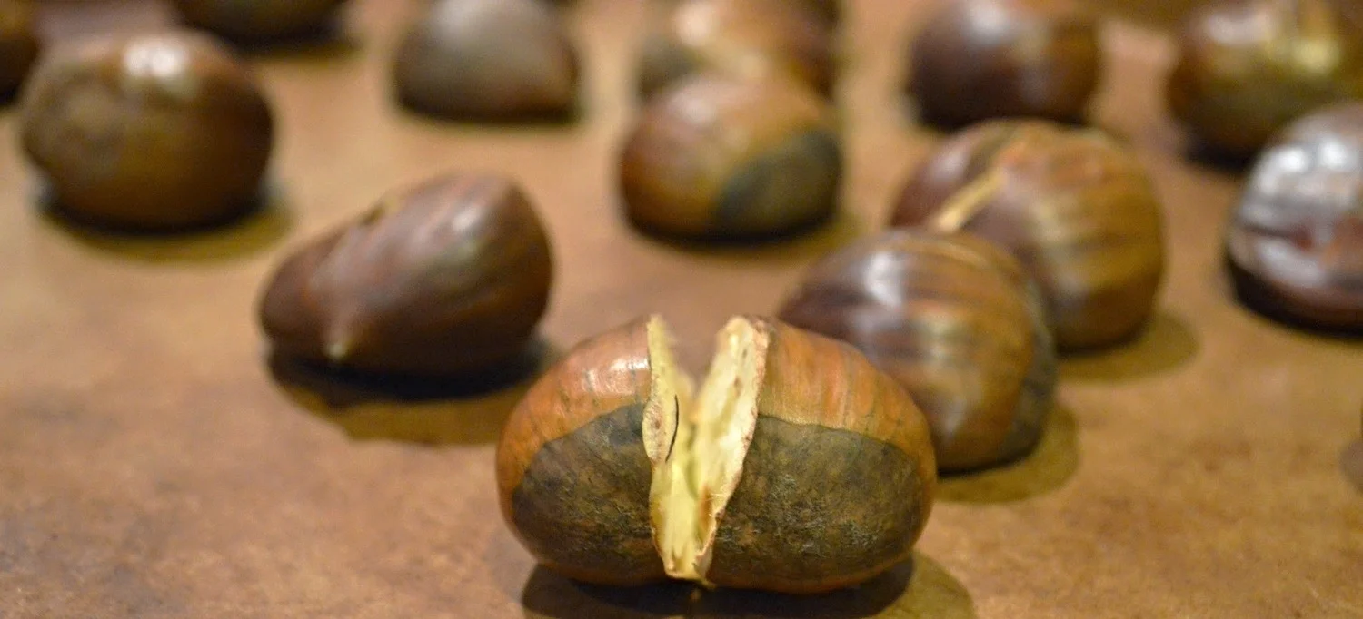 First, you score and roast the chestnuts, removing them from their shell once they're cool enough to handle.