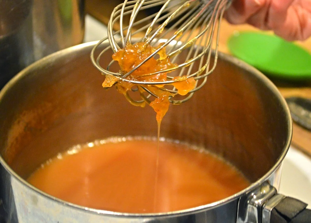 See those bits stuck to the whisk--just keep stirring and eventually the heat will melt them and they'll dissolve into the rest of your caramel sauce. Now go get a good night's sleep so you can wake up fresh and relaxed and ready to tackle the rest of this masterpiece!