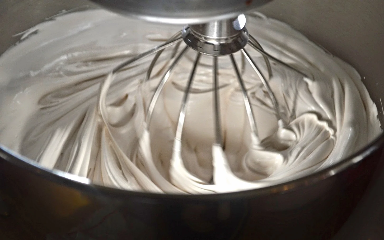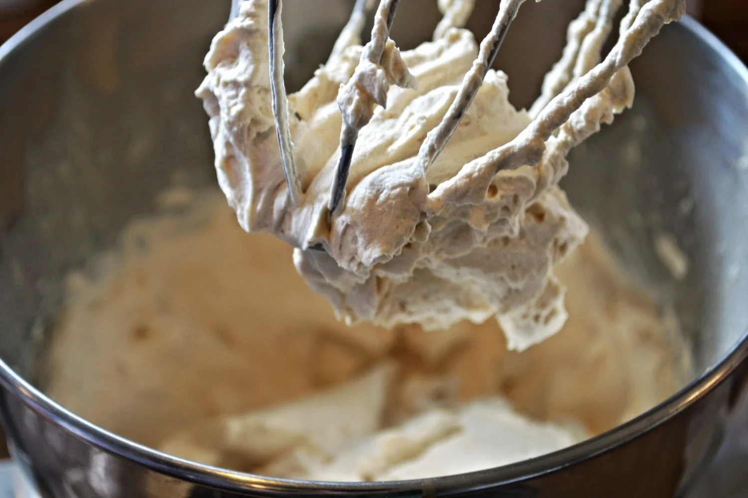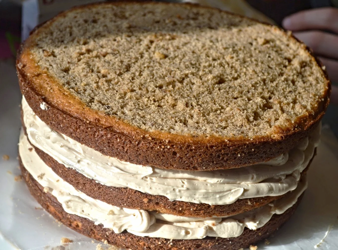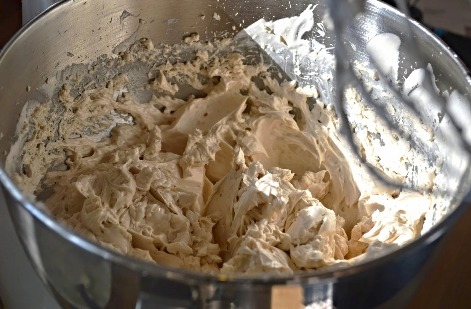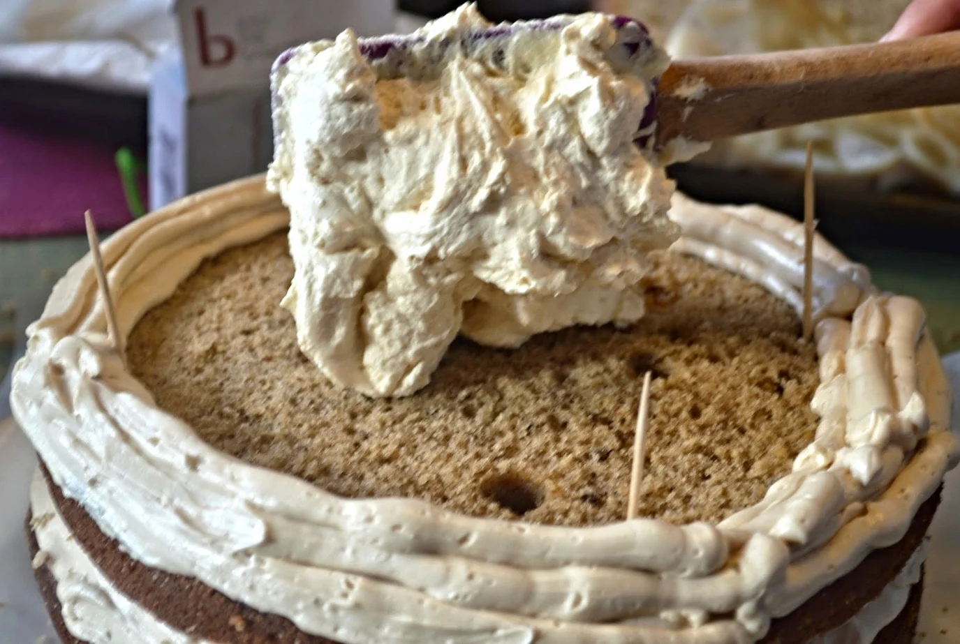 Day Two is all about frosting and assembly. First you make your Brown Sugar Buttercream which is easy but involves whipping a lot of egg whites, giving it a light fluffy feel.