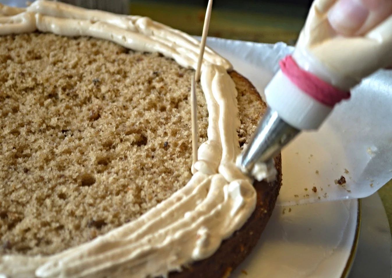 Then it's just a matter of putting the whole thing together. Since you want to pipe the buttercream frosting around the edges and fill the center with the caramel mousse, one of my brilliant offspring came up with the idea to mark it off with toothpicks to help you know where to start and stop with the different frostings.