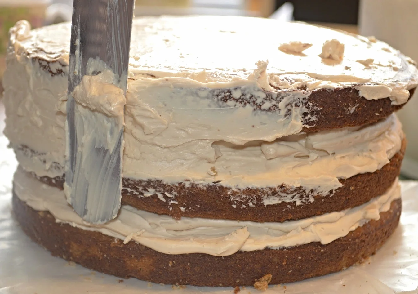 11. Once cake has chilled, remove from freezer and cover cake all over with remaining buttercream, using an offset spatula. Refrigerate for about 30 minutes until the frosting is set.