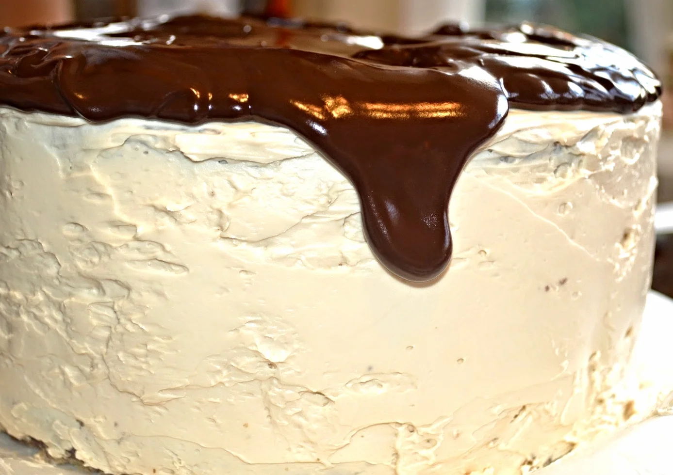 Once you've assembled all the layers, you cover the whole thing in a to-die-for dark chocolate ganache glaze.