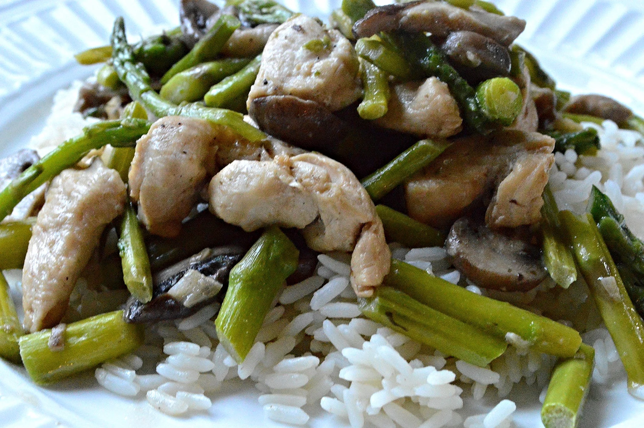 How was your weekend? Did you do anything fun? I wouldn't exactly call ours a fun weekend, but it was productive. We had our tag sale on Saturday, sold a lot of stuff, gave away a lot of stuff and are happy that our house is much cleaned out. But, whew, is it tiring! So many trips up and down those basement stairs!! If you're a little worn out from your weekend, how about trying this easy-to-make chicken, asparagus and mushroom stir-fry--it's so delicious and perfect for those hot summer nights when you don't want to turn on the oven!