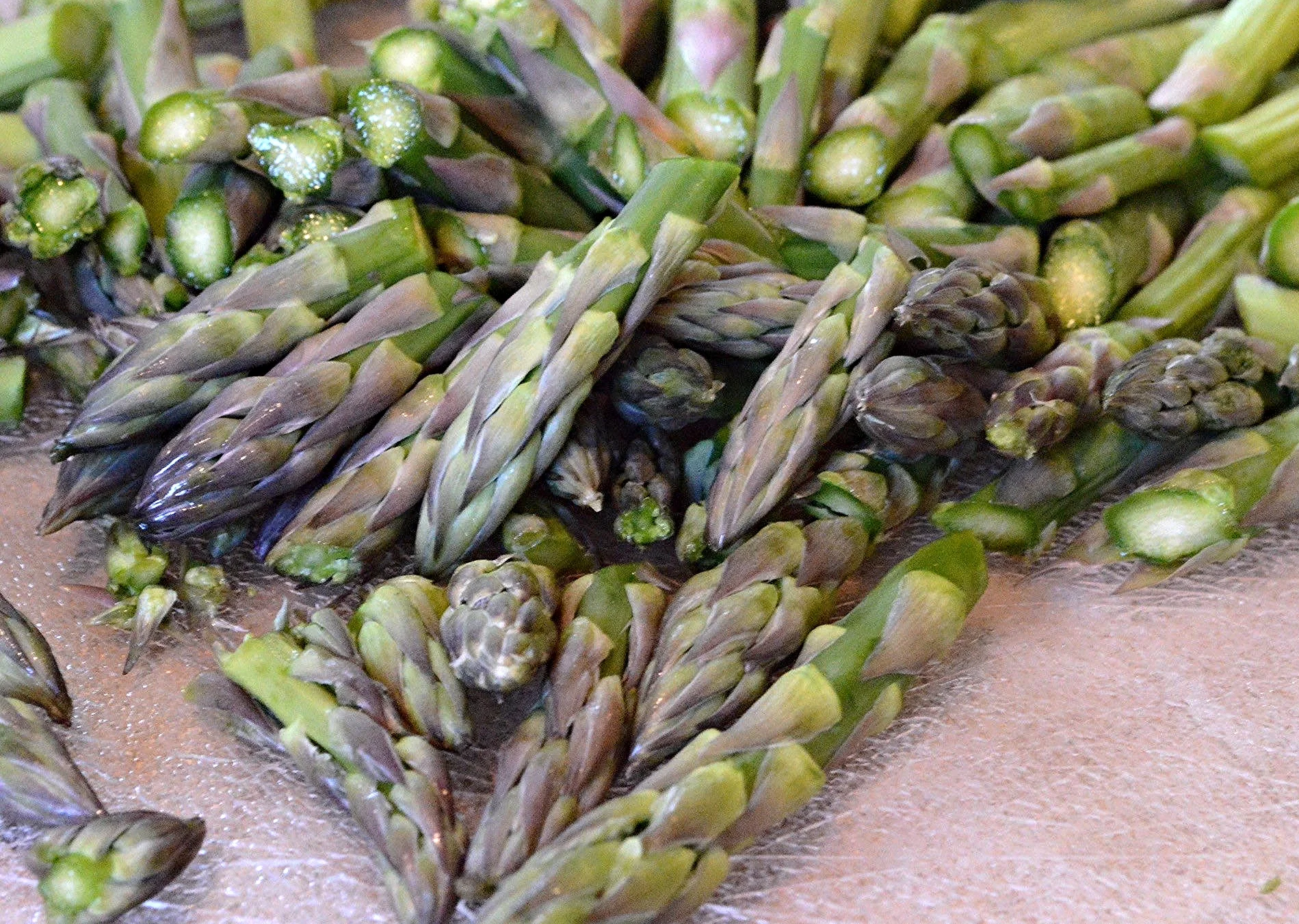 First thing you do is to saute some asparagus and then steam them until they're just tender.