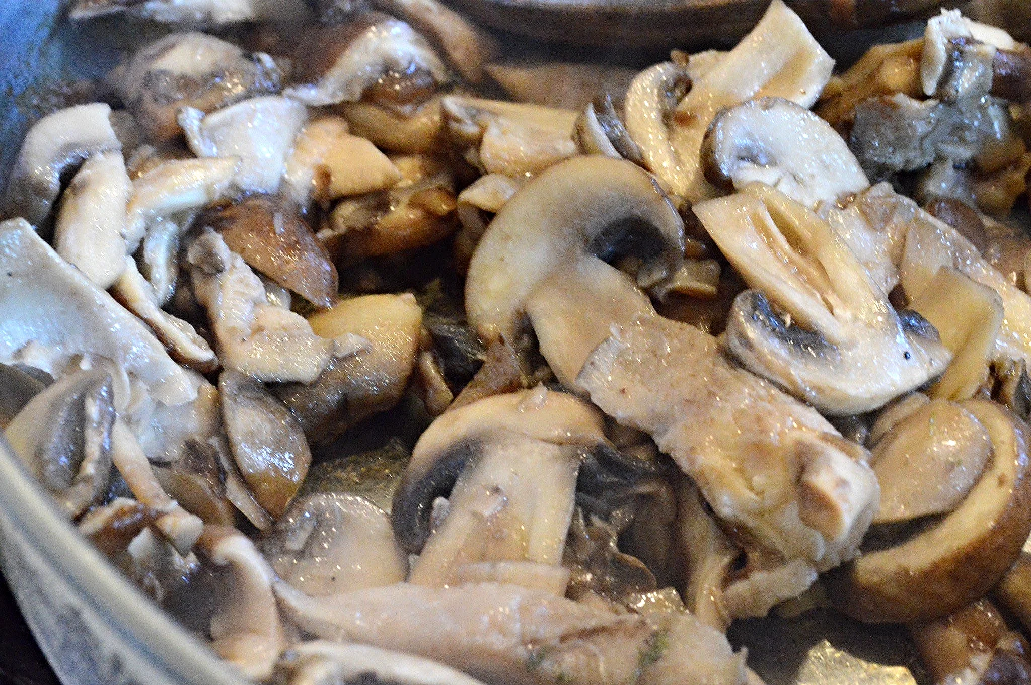 Then in the same pan (read, less cleanup) you saute the mushrooms--any kind you like. I used a mixture of shiitake, baby bellas and regular old button mushrooms. If you like, you can even buy then pre-sliced, for more time-saving!