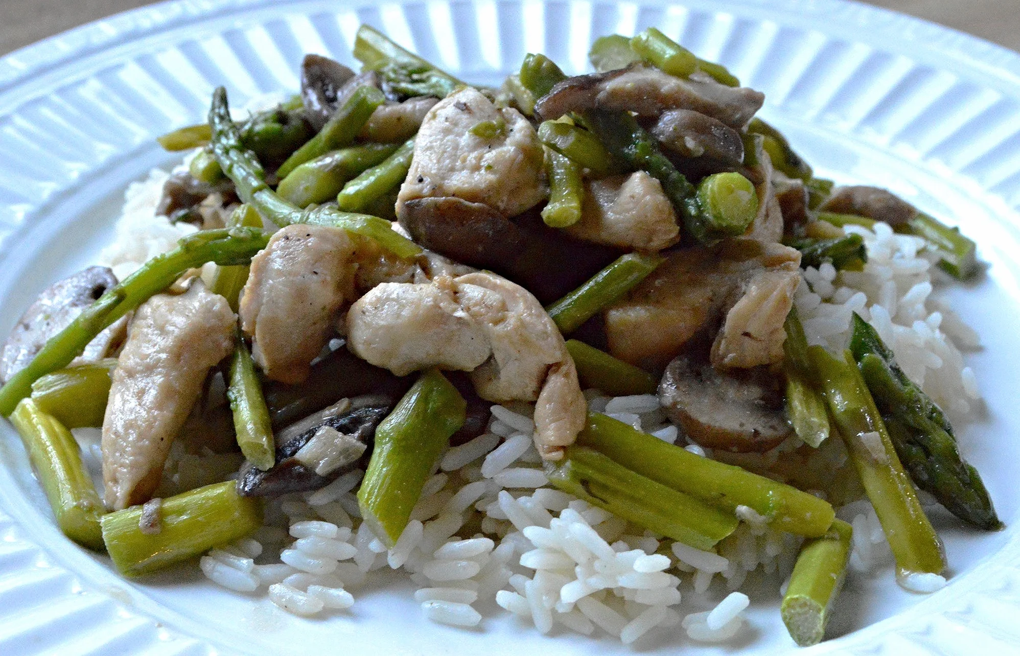 Note: Recipe adapted from http://www.bonappetit.com/recipe/chicken-asparagus-and-wild-mushroom-stir-fry. I played around with some of the proportions and used light cream instead.
