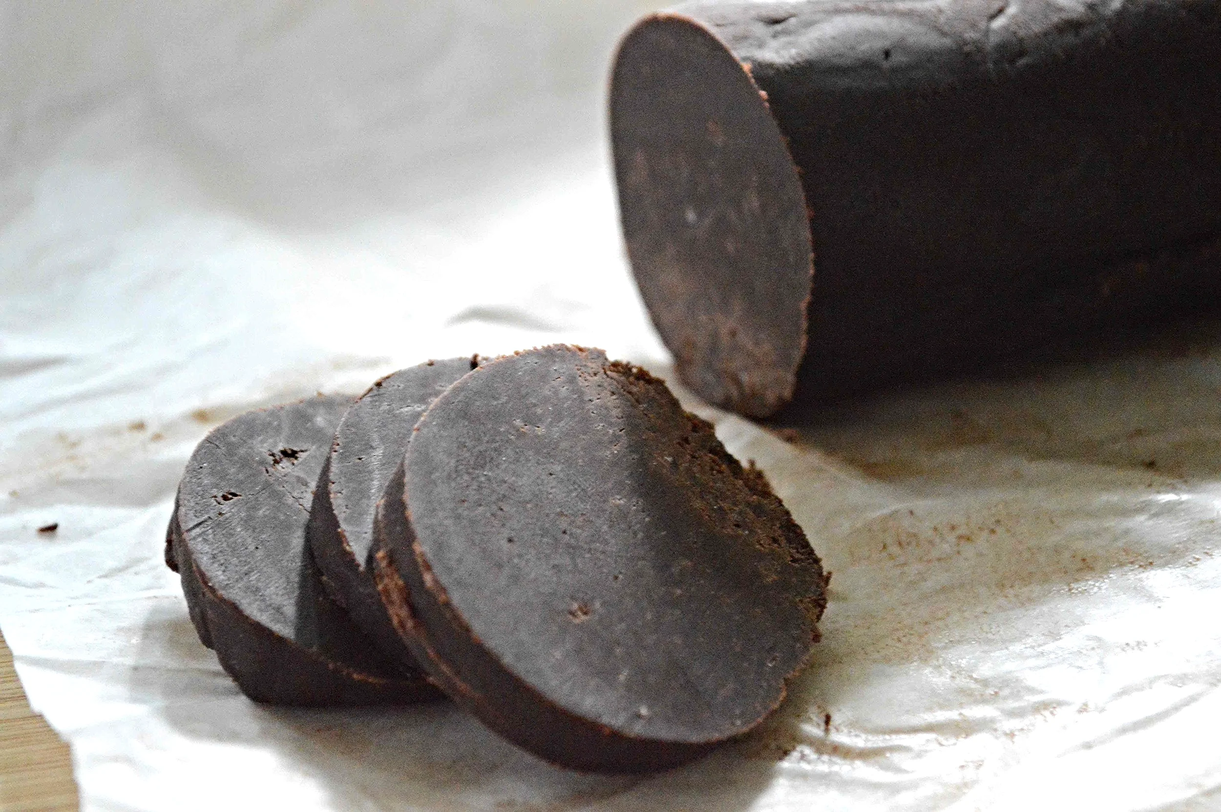 2. Into another medium bowl, stir together well the flour, cocoa powder salt and baking soda. Using a wooden spoon, stir the flour mixture into the chocolate mixture. When it starts to seem too floury, switch to using your hands until it comes together. At this point it kind of seems like Playdough. Let the dough sit uncovered at room temperature for 1 hour to firm up.