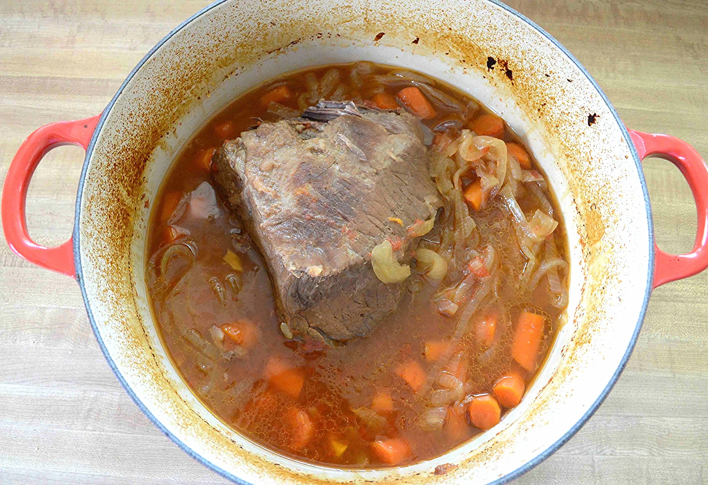 2. Bring to room temperature and place entire pot, covered into the refrigerator for at least overnight or up to 3 days. Remove from fridge and skim off the fat. Discard. Slice the meat thinly, place back into the gravy and heat on the top of the stove over a low light until hot. Serve immediately with mashed potatoes, pasta, rice or bread.