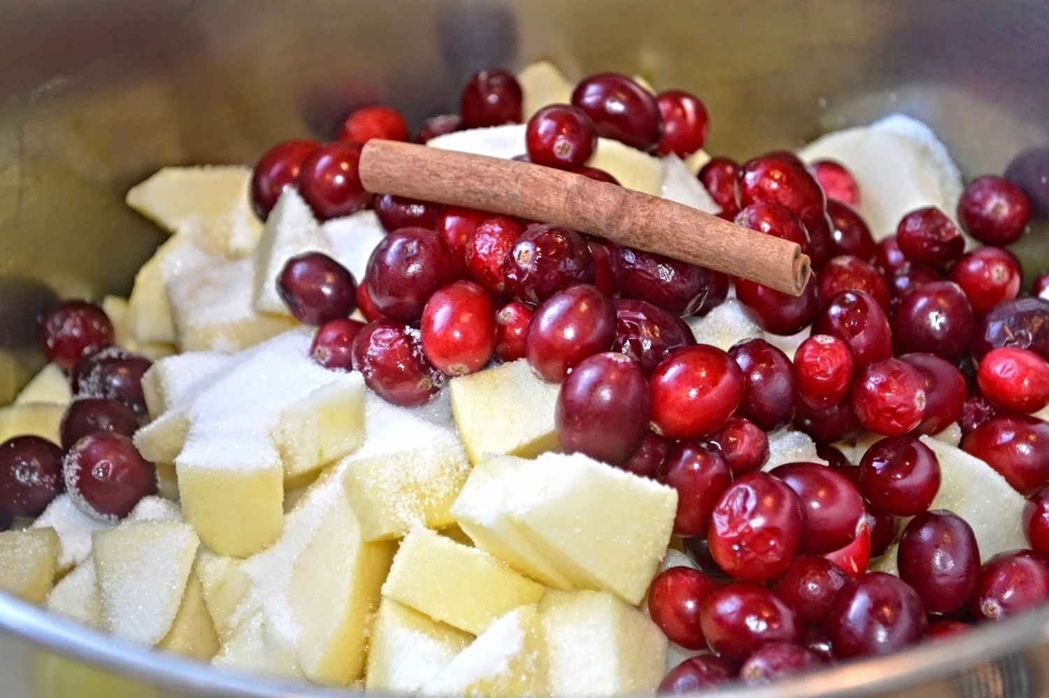 The secret here is cranberries! Not enough to overpower the taste of the apples, but enough to keep the applesauce delightfully tart and give it a gorgeous color.