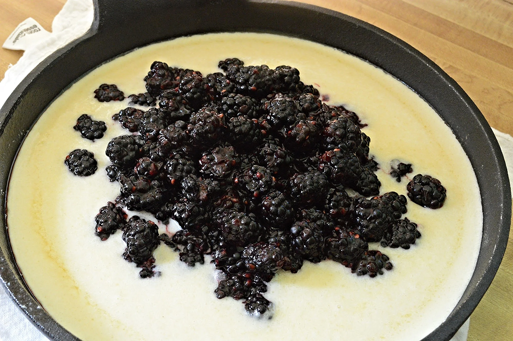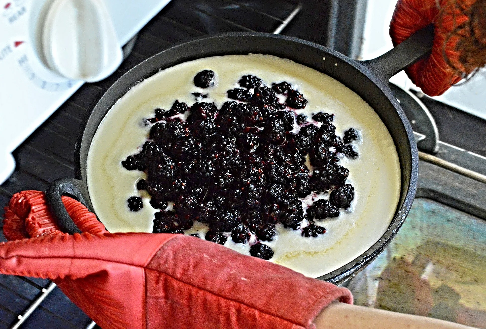 3. In another large bowl, whisk together the flour, baking powder and salt. Add in 1 cup of the sugar, the milk and the vanilla and stir until well blended. Once the butter has melted, remove the skillet or pan from the oven and pour the melted butter into the batter. Stir to mix. Then pour the batter all at one time into the skillet and add the blackberries into the center. Do not spread out.