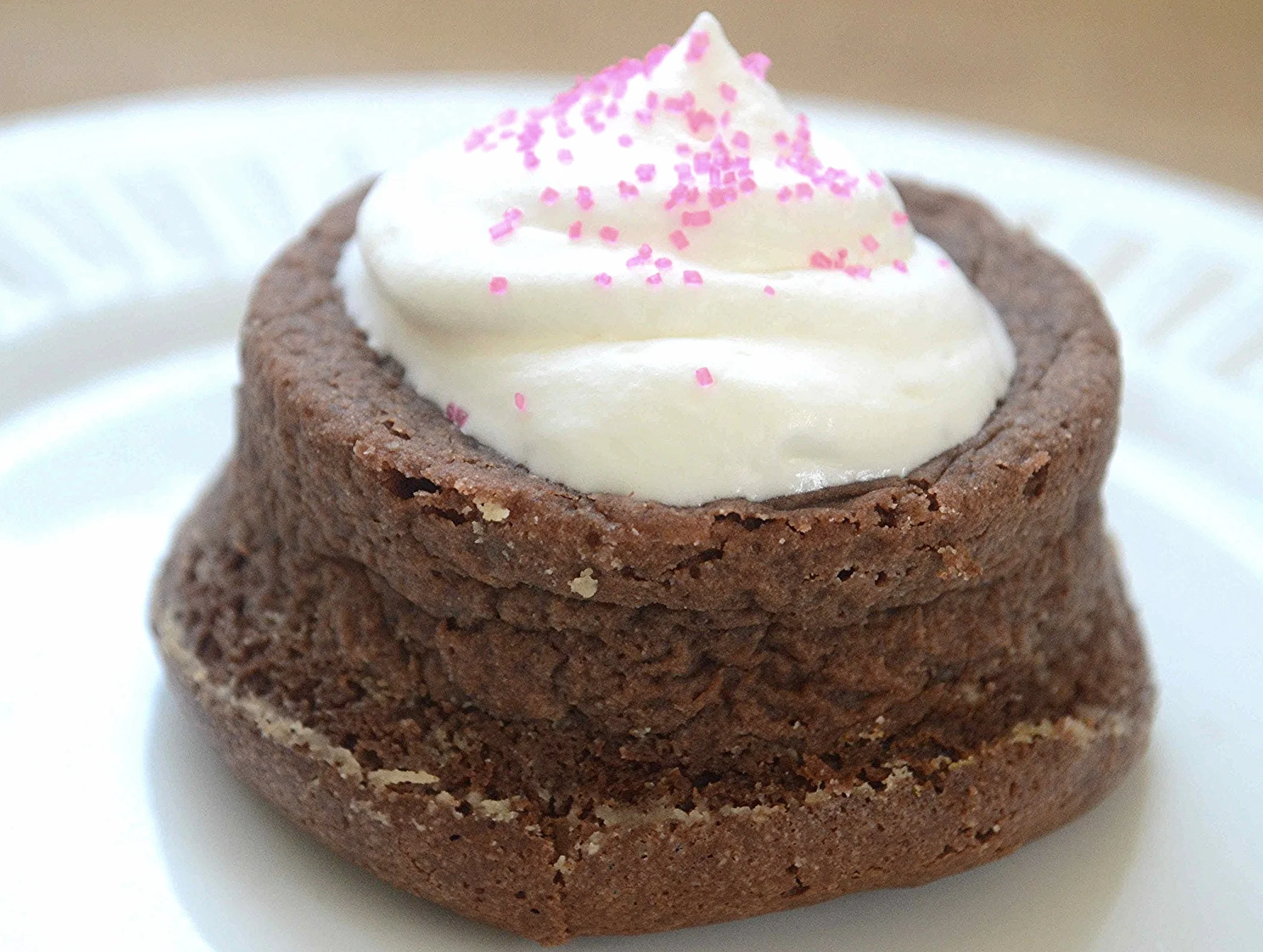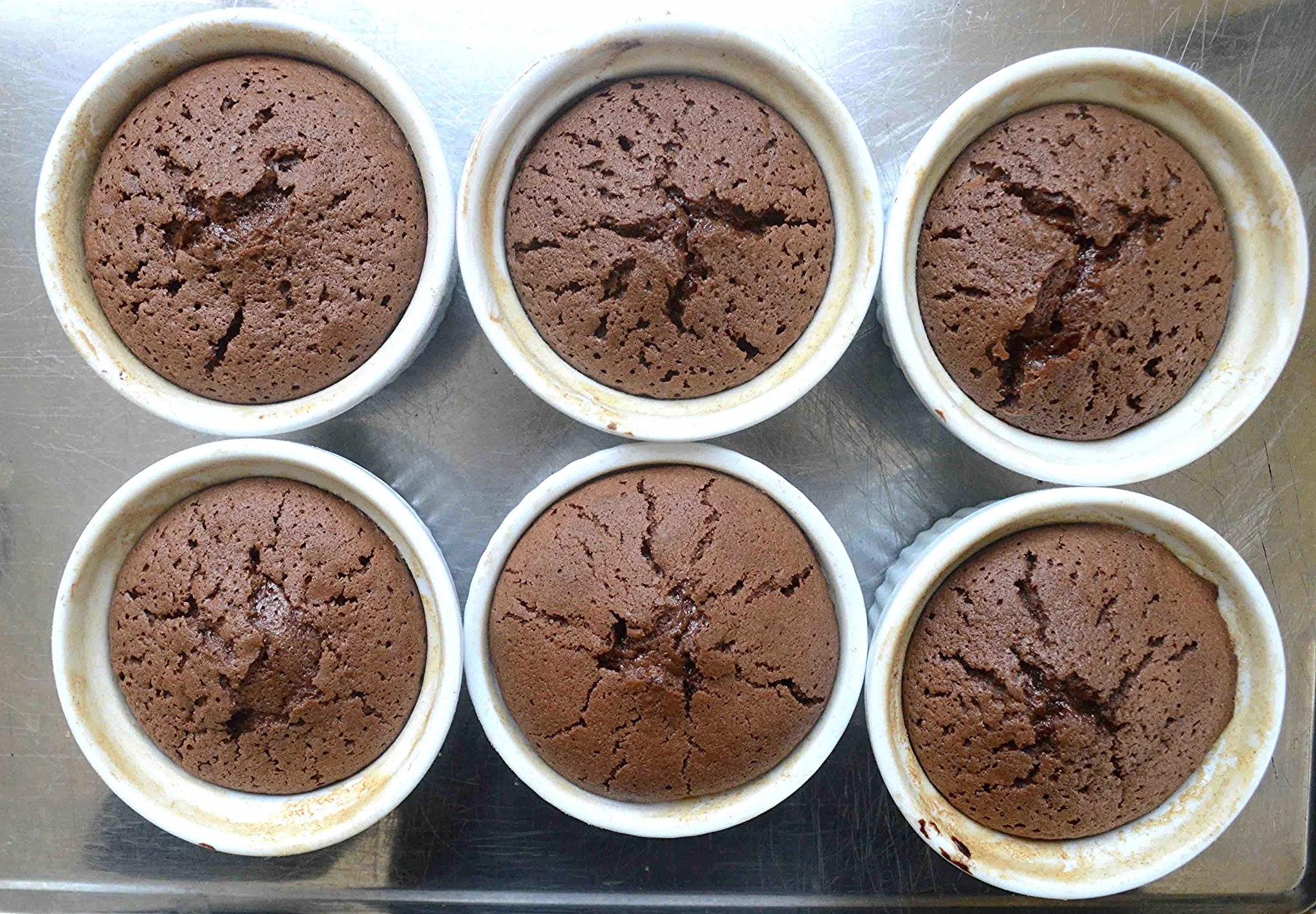 4. Bake for about 11- 12 minutes, until a tester comes out with moist crumbs and the tops are puffed and dry. If you want a very liquid center, start checking at the 9 minute mark. Let the puddings sit for a few minutes while you prepare the whipped cream.