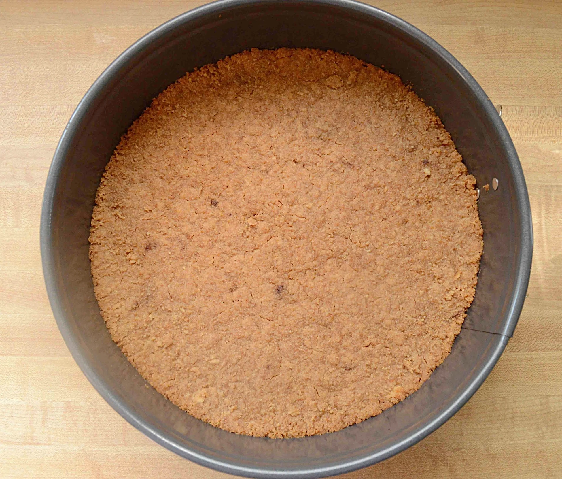 You start by whipping up a simple butter and ground vanilla wafer crumb crust which only bakes for about 6-8 minutes.