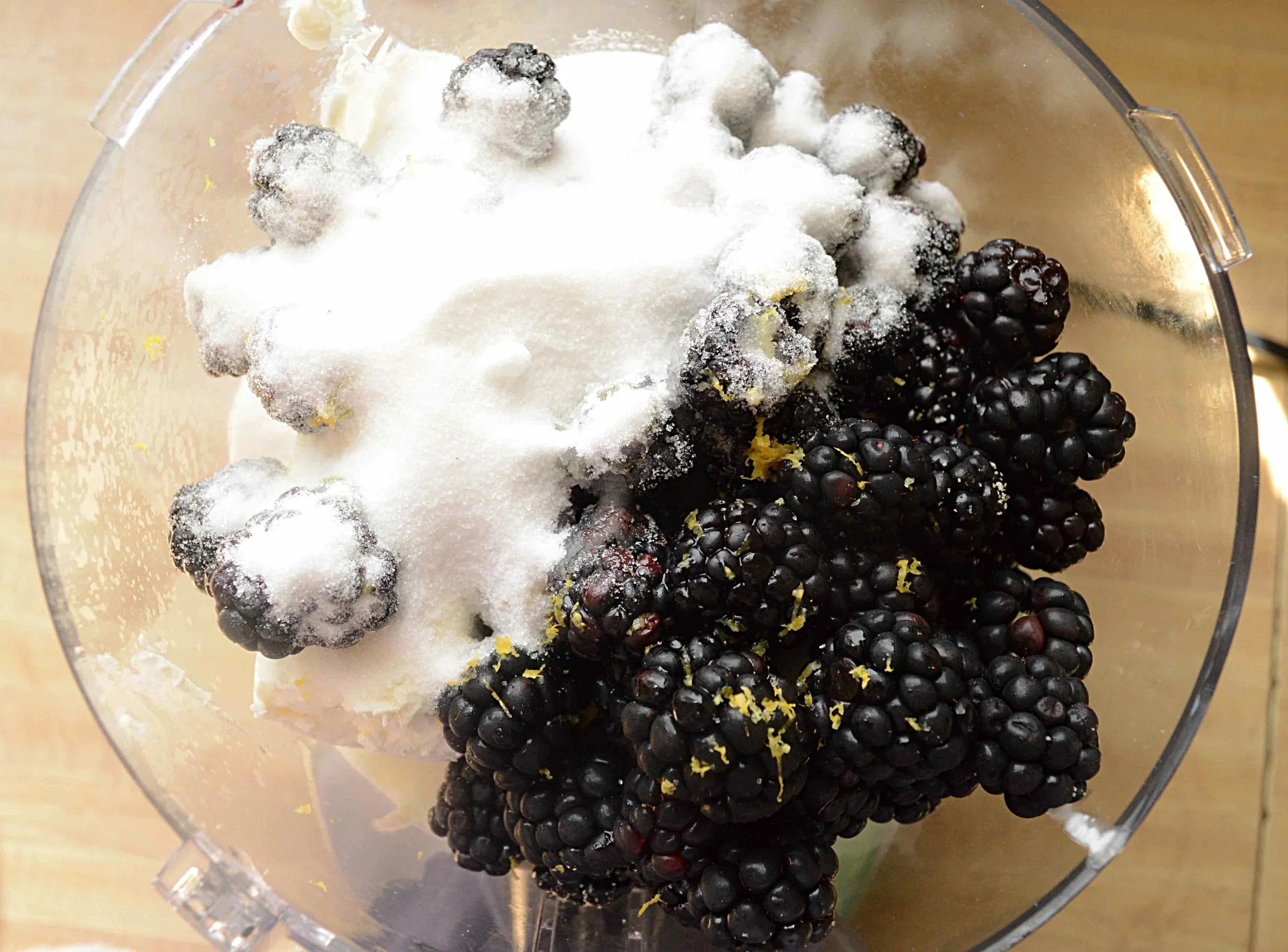 3. Place about an inch of water in the bottom of a small saucepan that will fit the bowl with the softened gelatin so that it can rest on top without touching the water. Bring the water to a bare simmer and place the bowl with the gelatin on top now, whisking constantly for about 30 seconds to 1 minute, just until the gelatin melts. With the food processor running, pour the gelatin mixture through the feed tube into the blackberry mixture and process until smooth. Taste the filling and add more sugar if you think it needs it. It will depend on how sweet your blackberries are. If so, add by a spoonful or two at a time and process again.