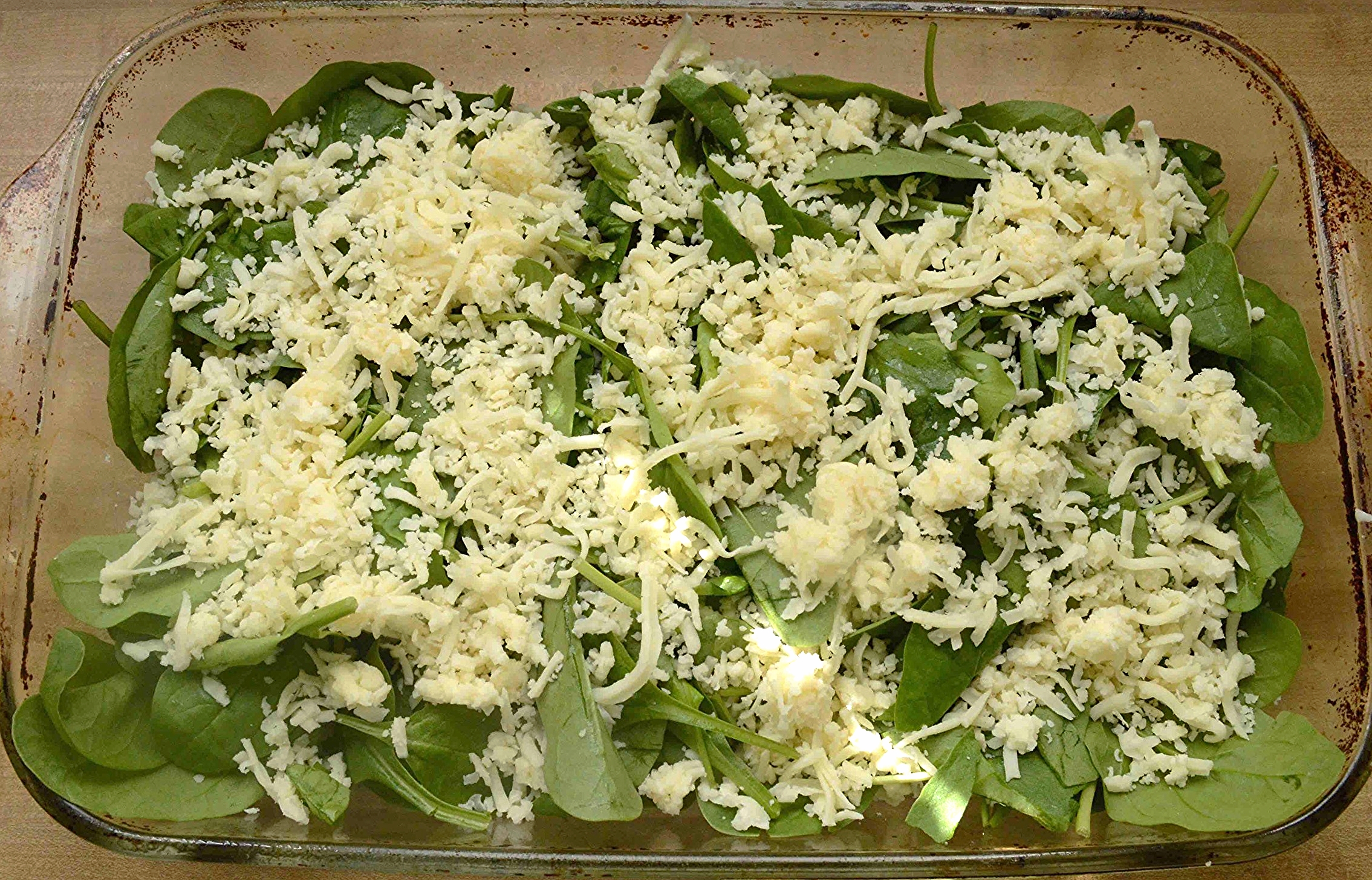 You top the spinach with some shredded cheese--the original recipe calls for fontina but I had a ton of Monterey Jack in the house that needed to be used up, so that's what I subbed in.
