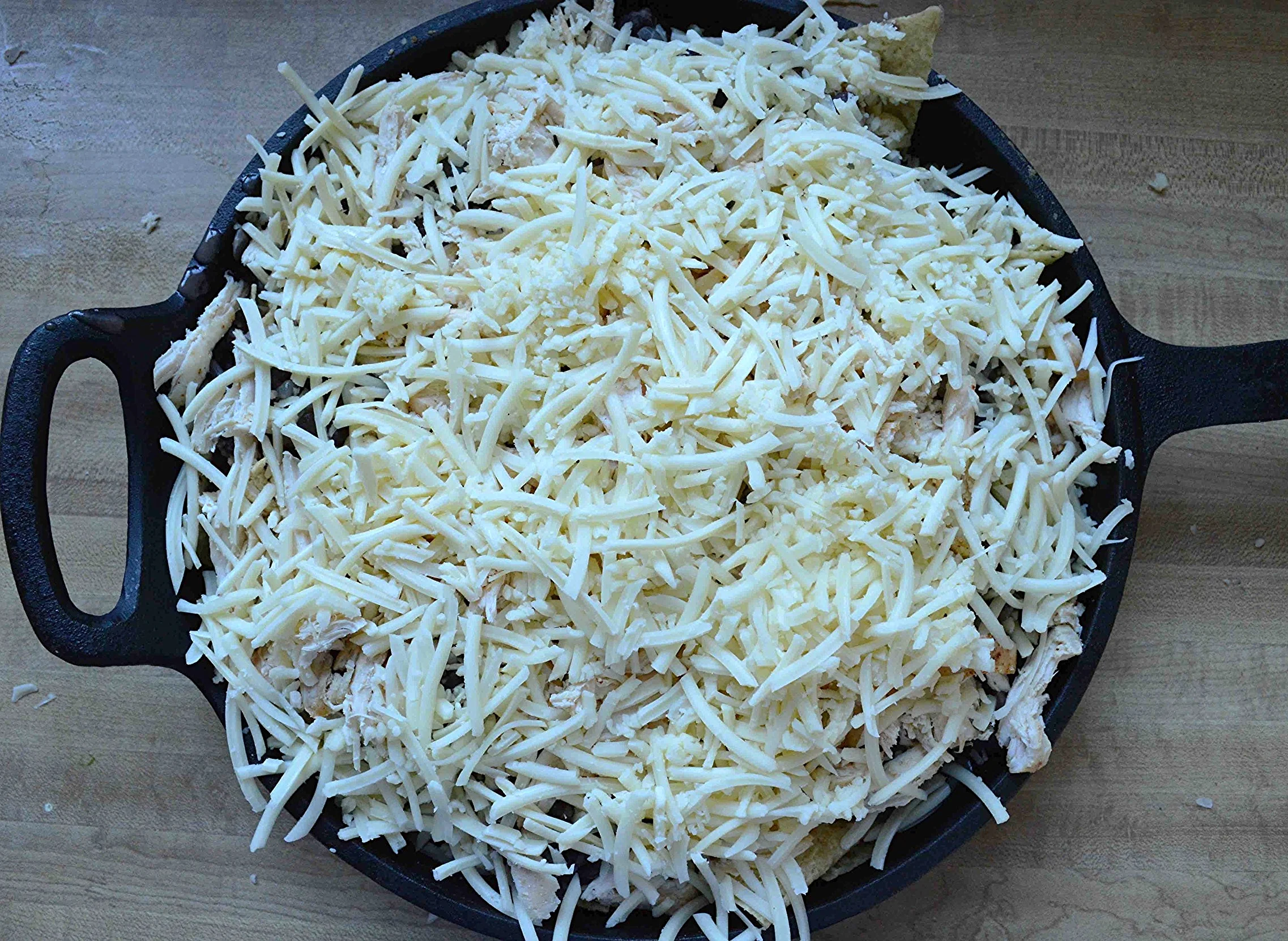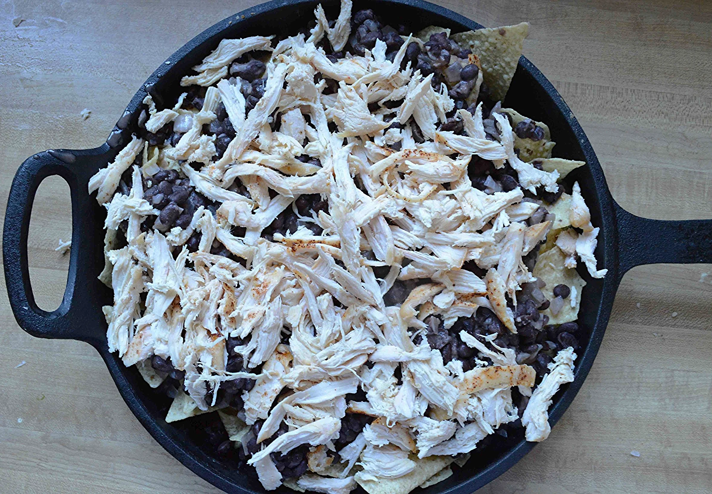 3. To assemble the nachos: Preheat the broiler. If you have a large cast-iron pan, this is the time to use it. Otherwise use any heat-proof pan or baking sheet you like. Place a large amount of the chips in the pan and top with the beans. Layer the chicken on top and then the Monterey Jack. Place under the broiler and heat for 4-6 minutes, until the cheese is melted and all is heated through. Keep an eye on it so it doesn't burn.