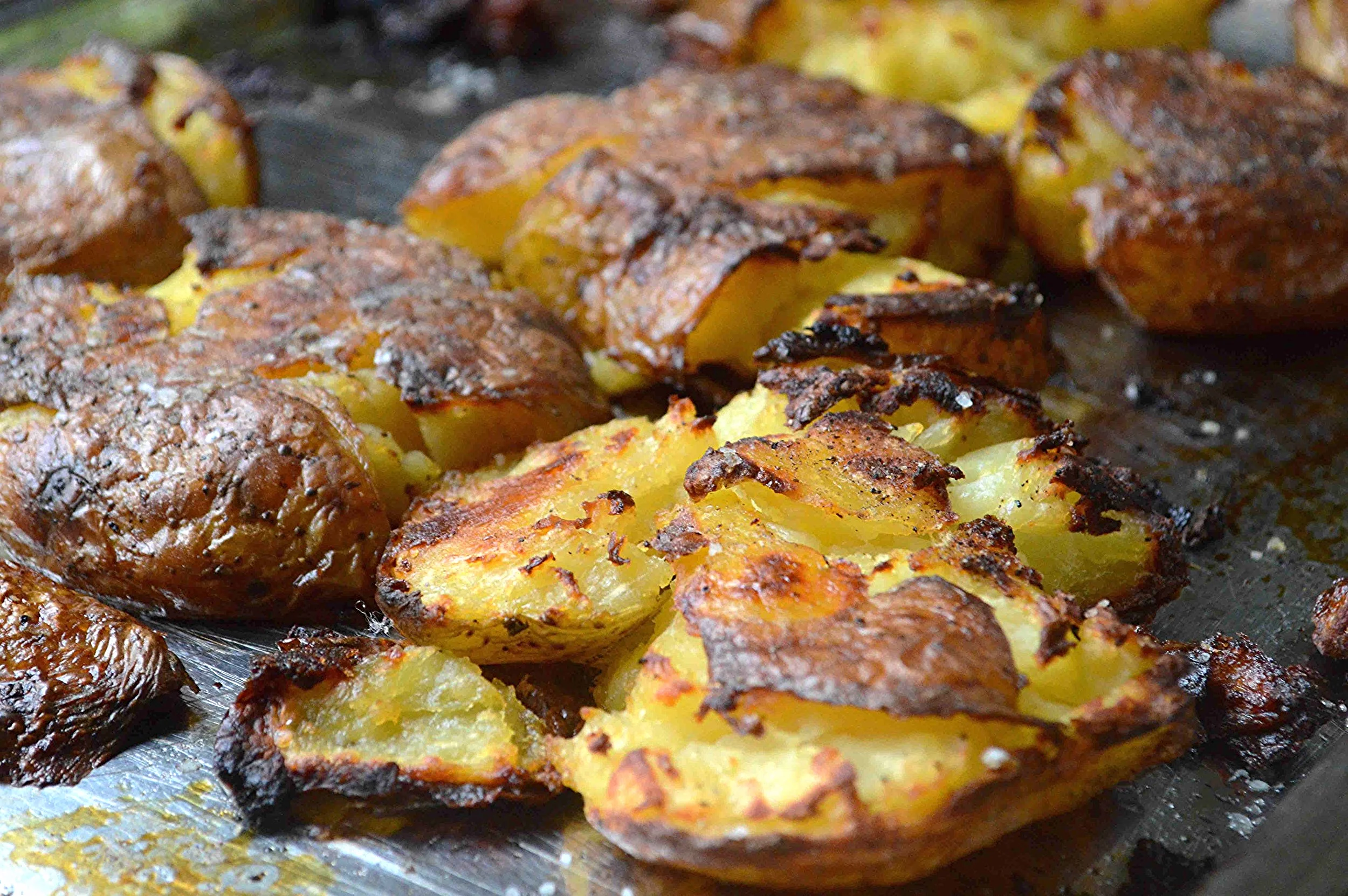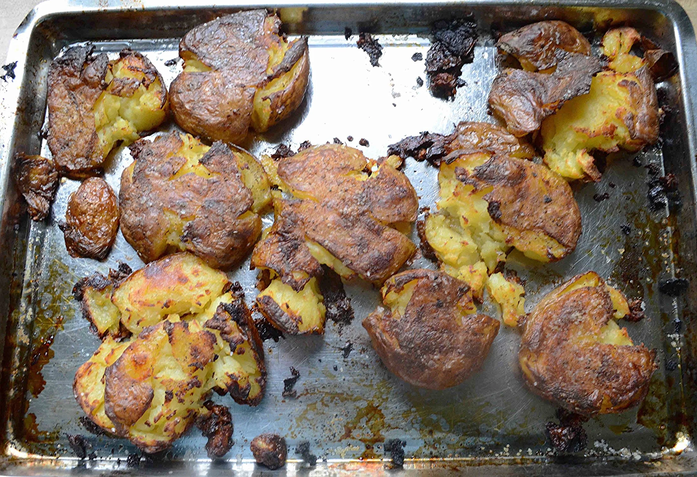 Little bits of the smashed potatoes fall off and get extra crunchy and these are so sought after that there will be surprising offers to clean up after dinner so that certain people can have better access to those little pieces of heaven that stick to the pan!