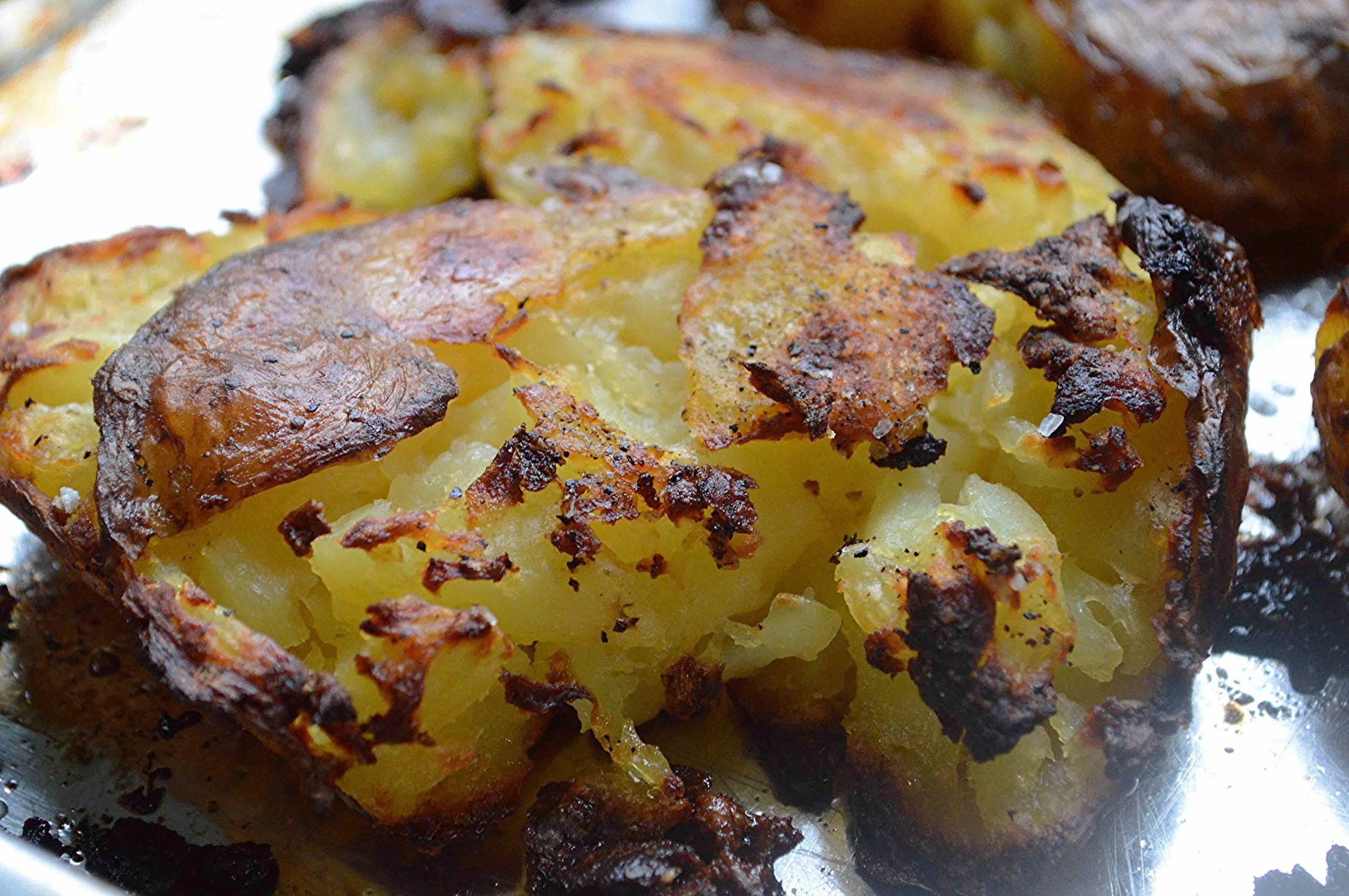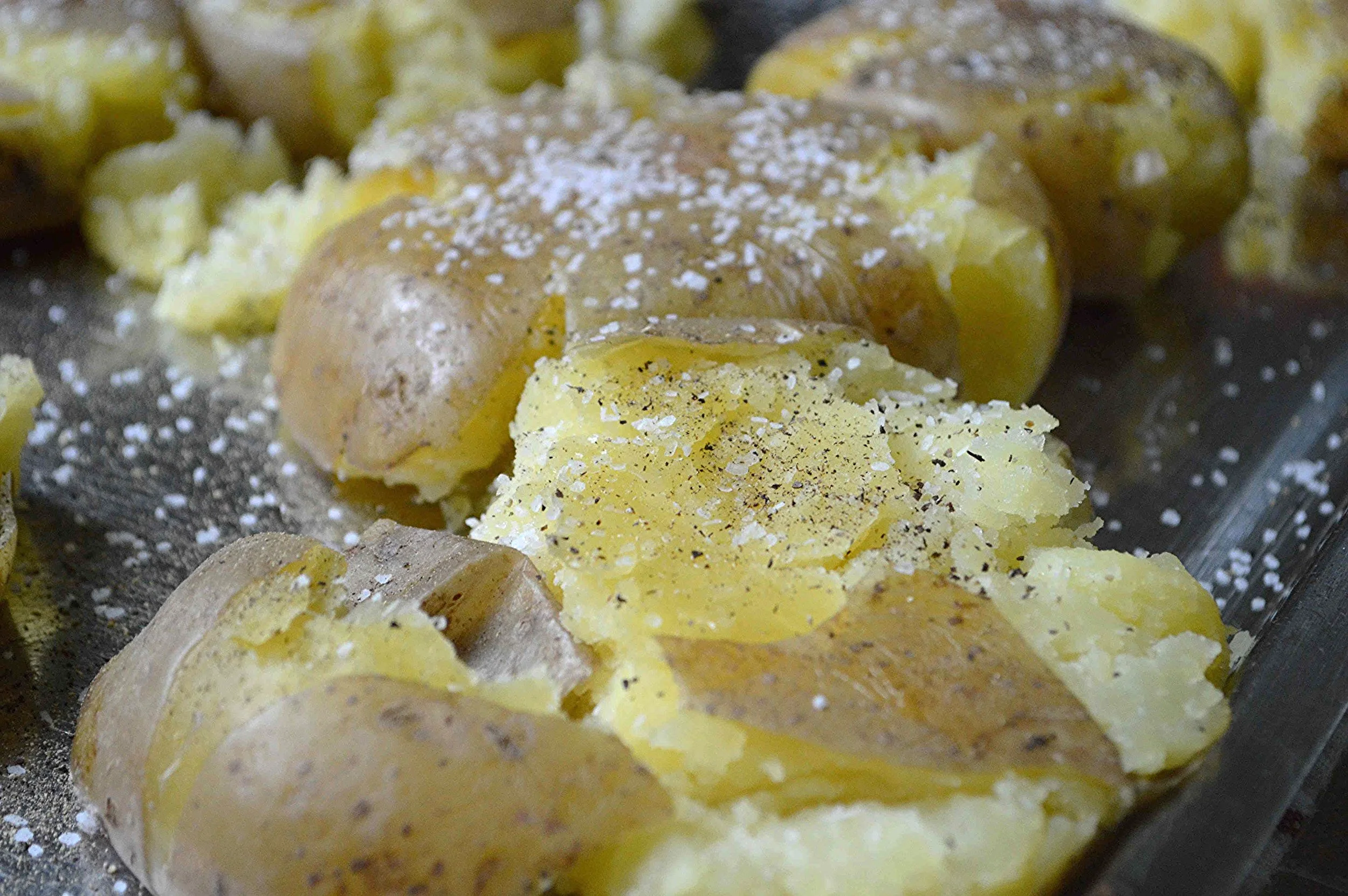 You start with ordinary baked potatoes that get literally smashed by having a heavy pan crush down on them. They're then salted, peppered and anointed with olive oil and returned to the oven to roast and get amazingly crunchy crusts while the insides of the potato remain creamy.