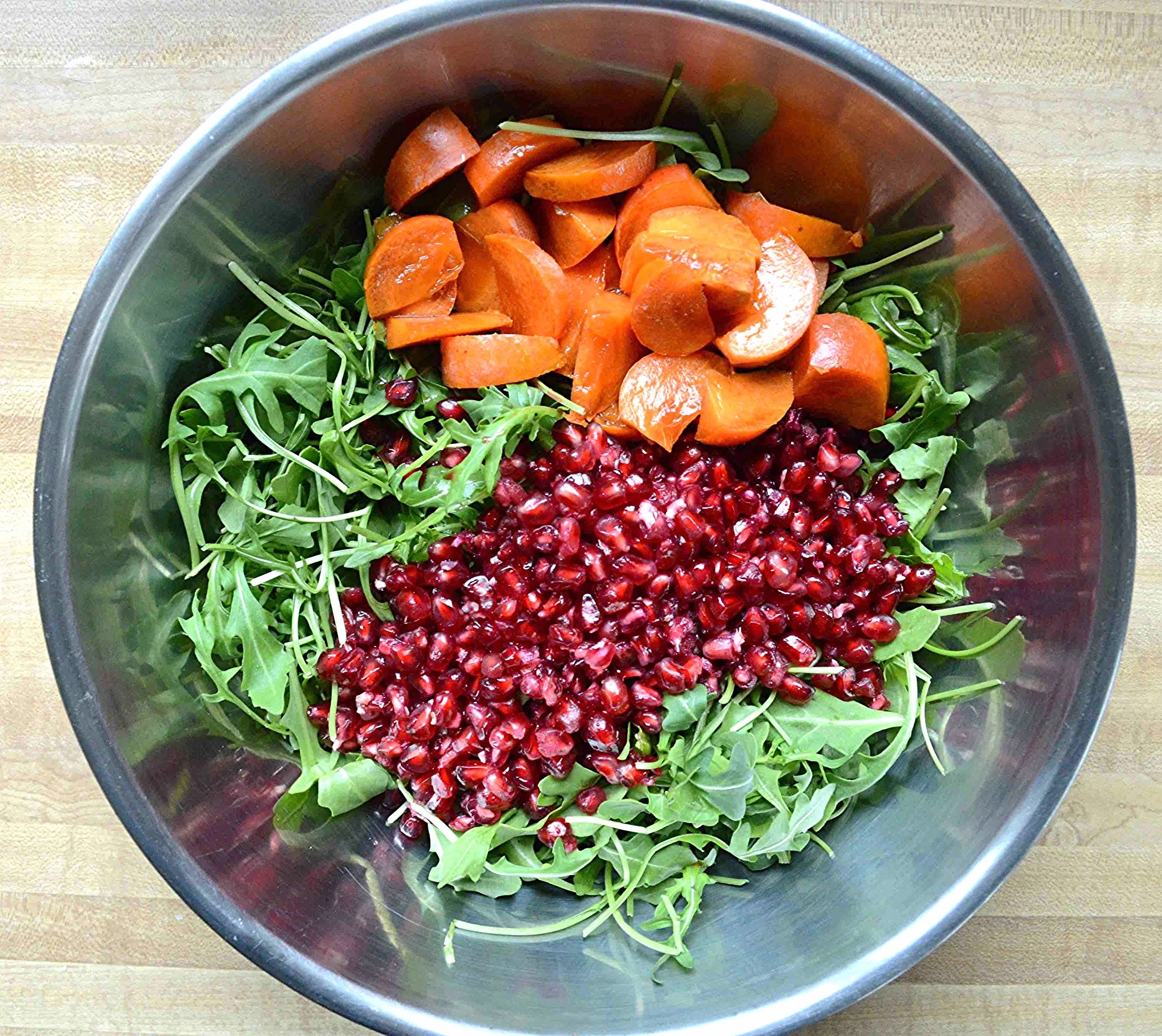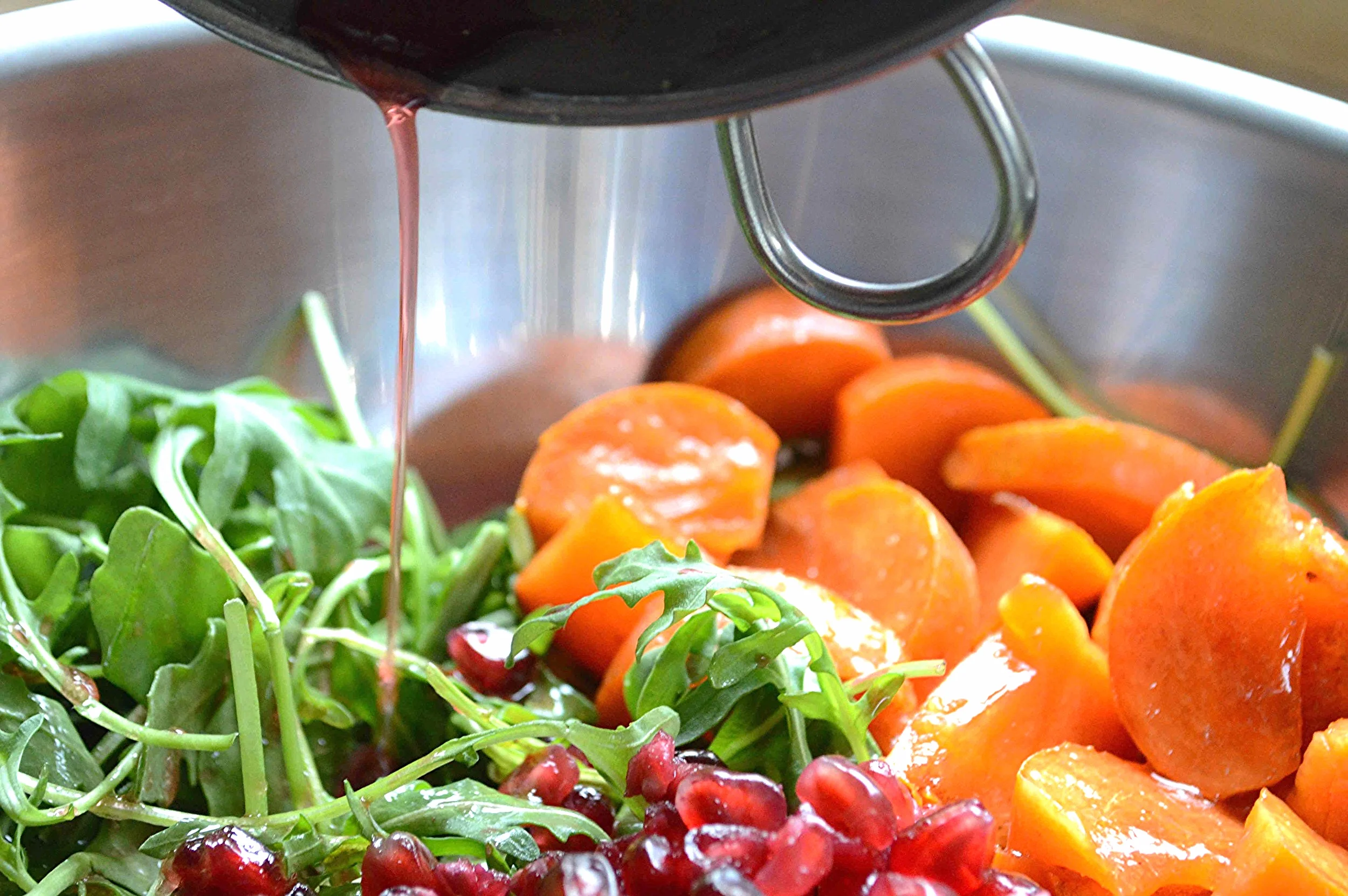 1. Place the arugula, pomegranate seeds and persimmons in a large salad bowl and mix together gently. Set aside.