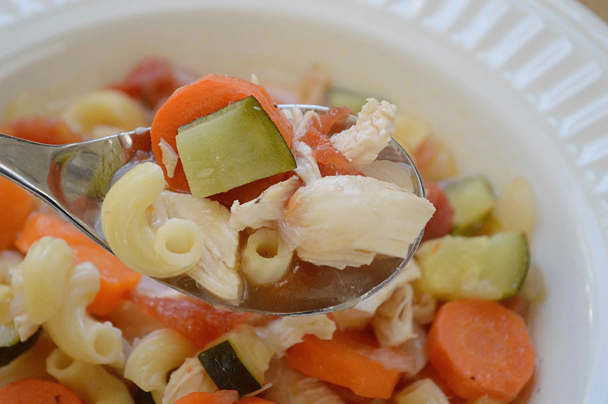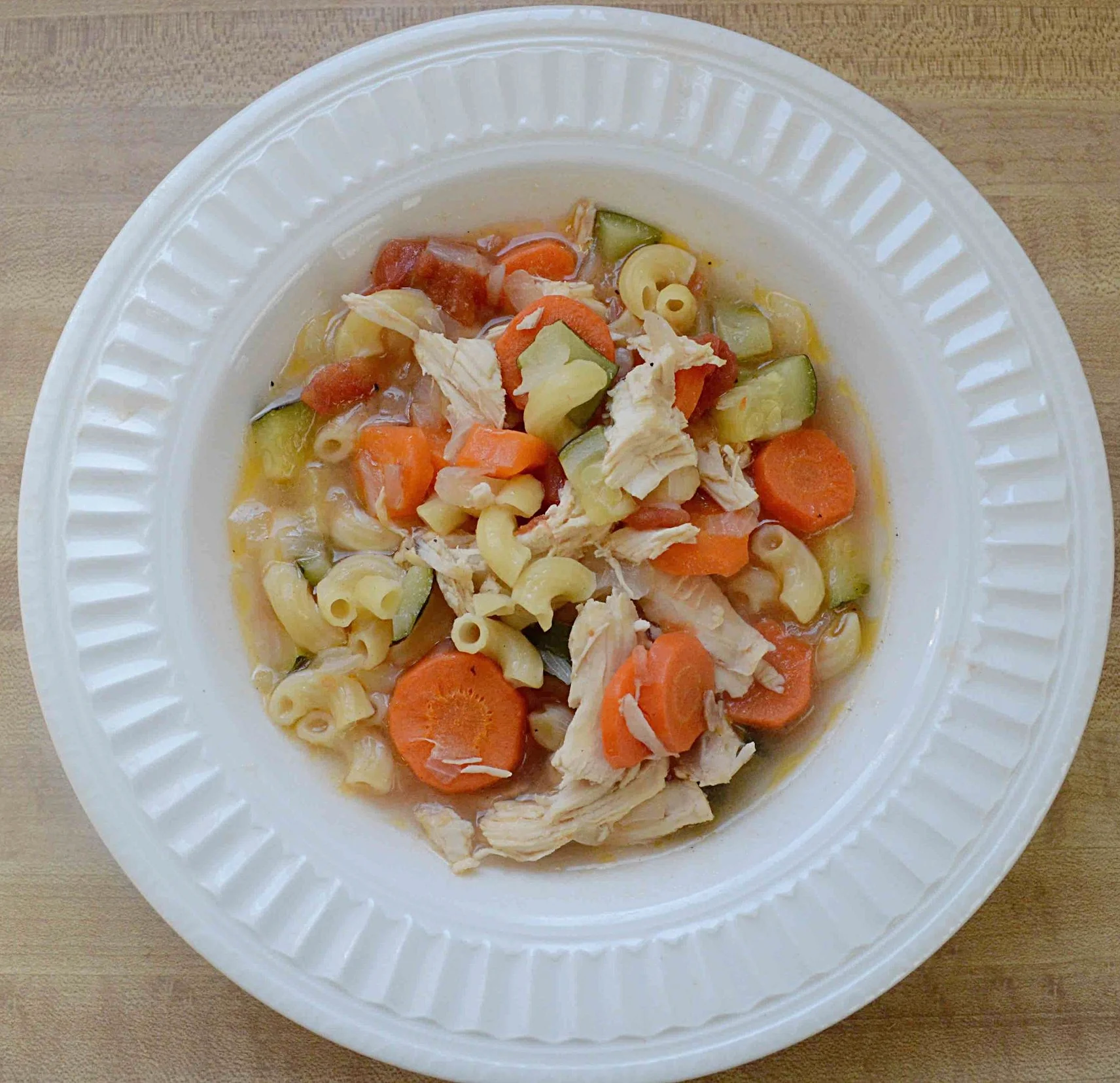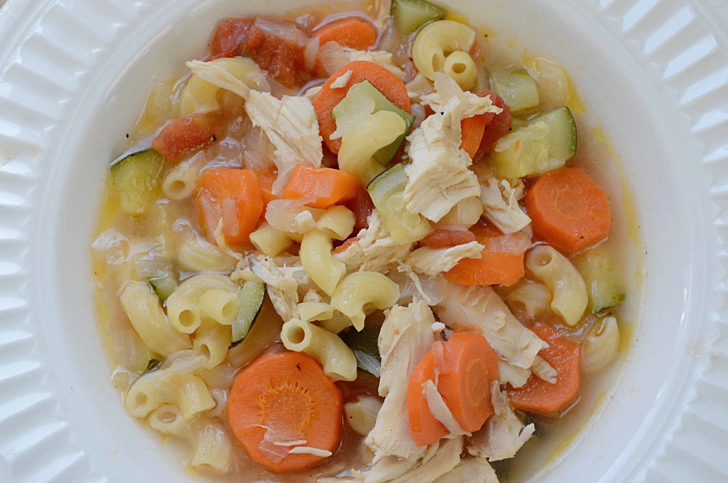 3. Transfer the chicken to a clean plate and let sit until cool enough to handle. Throw away skin and bones and shred the chicken into bite-sized pieces. Add back into the pot. Turn the heat to medium and add in the zucchini, macaroni and tomatoes and cook for about 5-8 minutes, until the pasta is cooked through. Season with salt and pepper and serve.