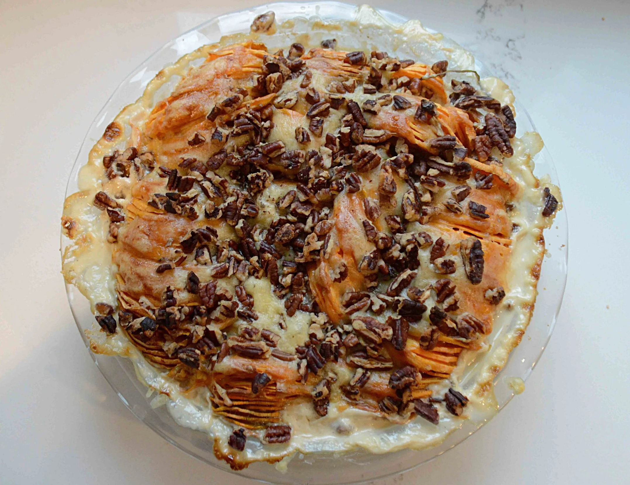 But now, let me talk about the taste, because this is not just another pretty face, if you get my drift. Think gooey, slightly nutty cheese and crunchy pecans married to tender, thinly sliced sweet potatoes all in a light but creamy sauce. It's hearty enough to be a vegetarian main dish and equally wonderful as a side (maybe as an alternative to that sweet potato marshmallow thing you've been making for years?). Who knows, maybe they'll all be openminded and like it even better!!Let the Thanksgiving prep begin!!