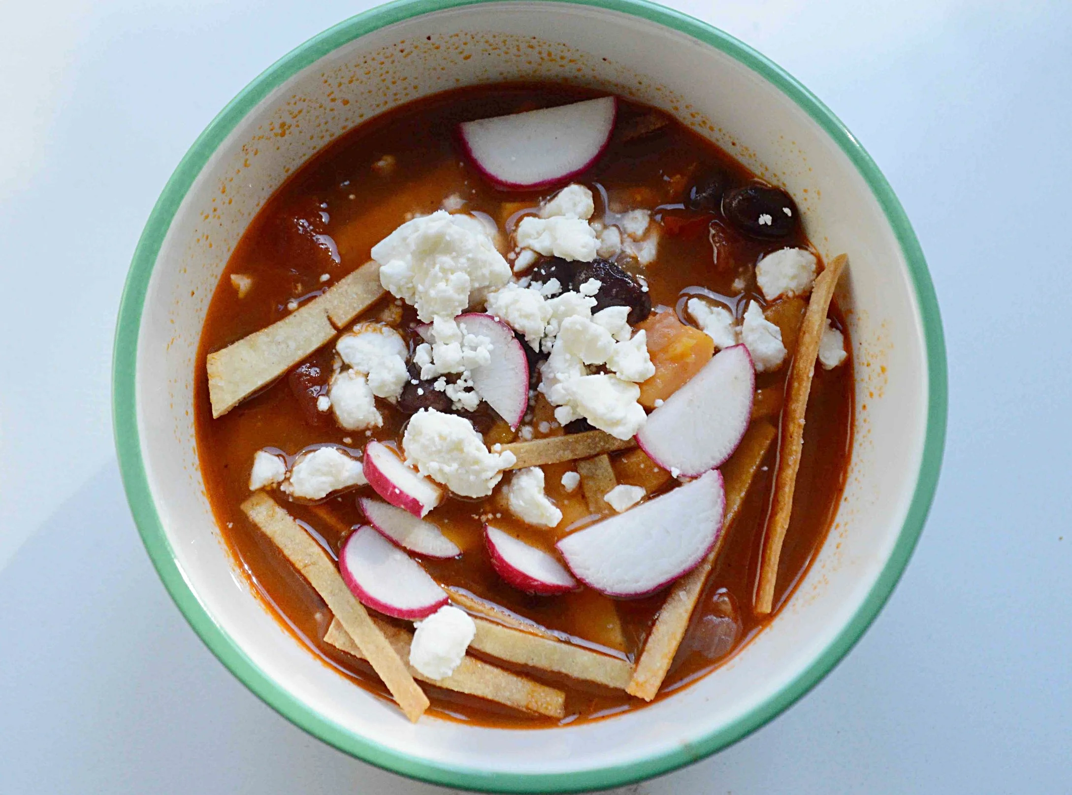 3. To serve the soup: Place a few tortilla strips in the bottom of each bowl. Top with a few ladlefuls of soup and then add additional tortilla strips on top.. Add on the radishes and feta if using. Serve immediately.