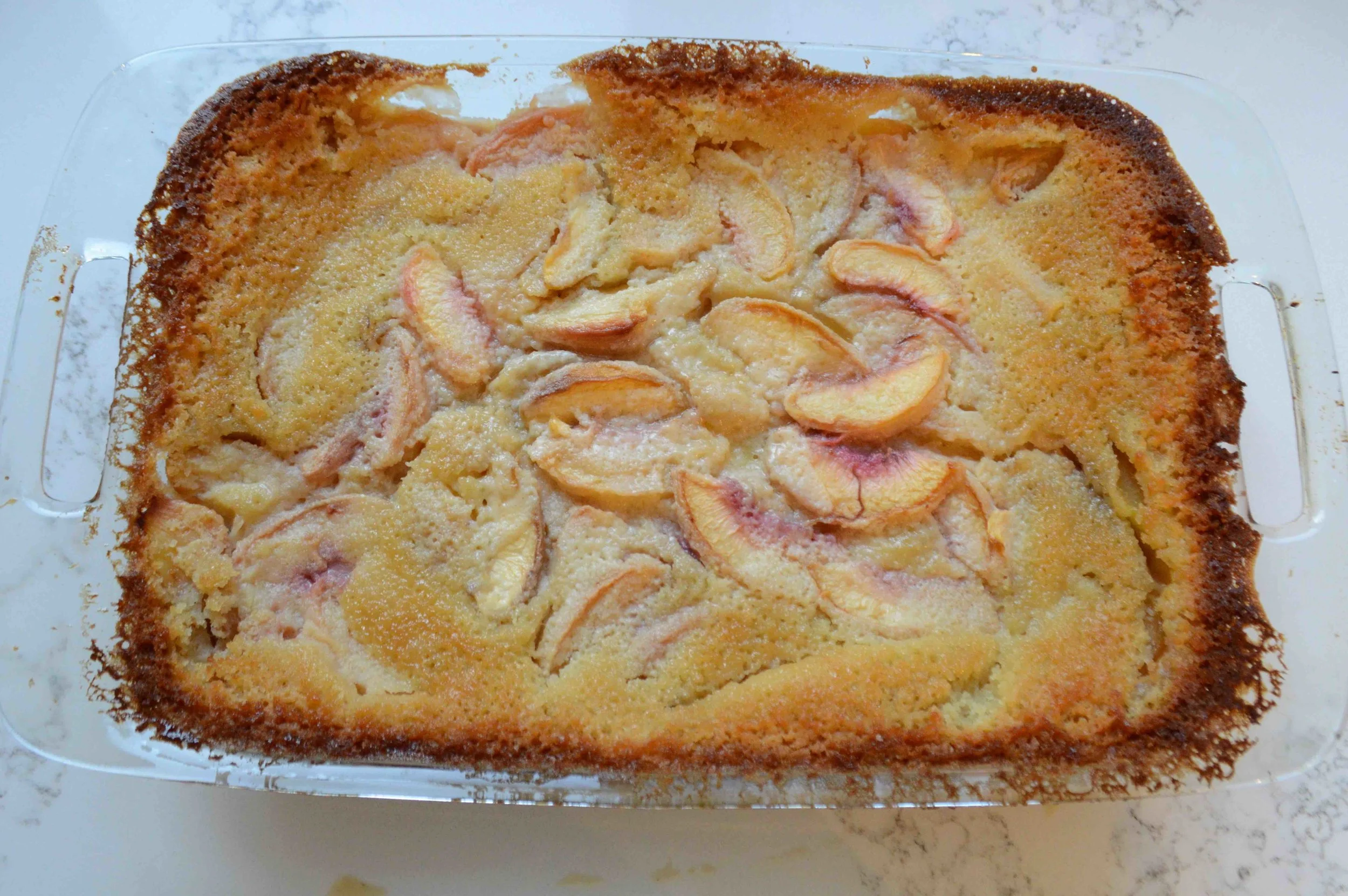 4. Scrape the batter into the prepared dish and place the peach slices all over the top, overlapping then if necessary. Spray a length of aluminum foil large enough to cover the pan and then with the sprayed side down, cover the pan tightly with the foil, sealing the edges well.