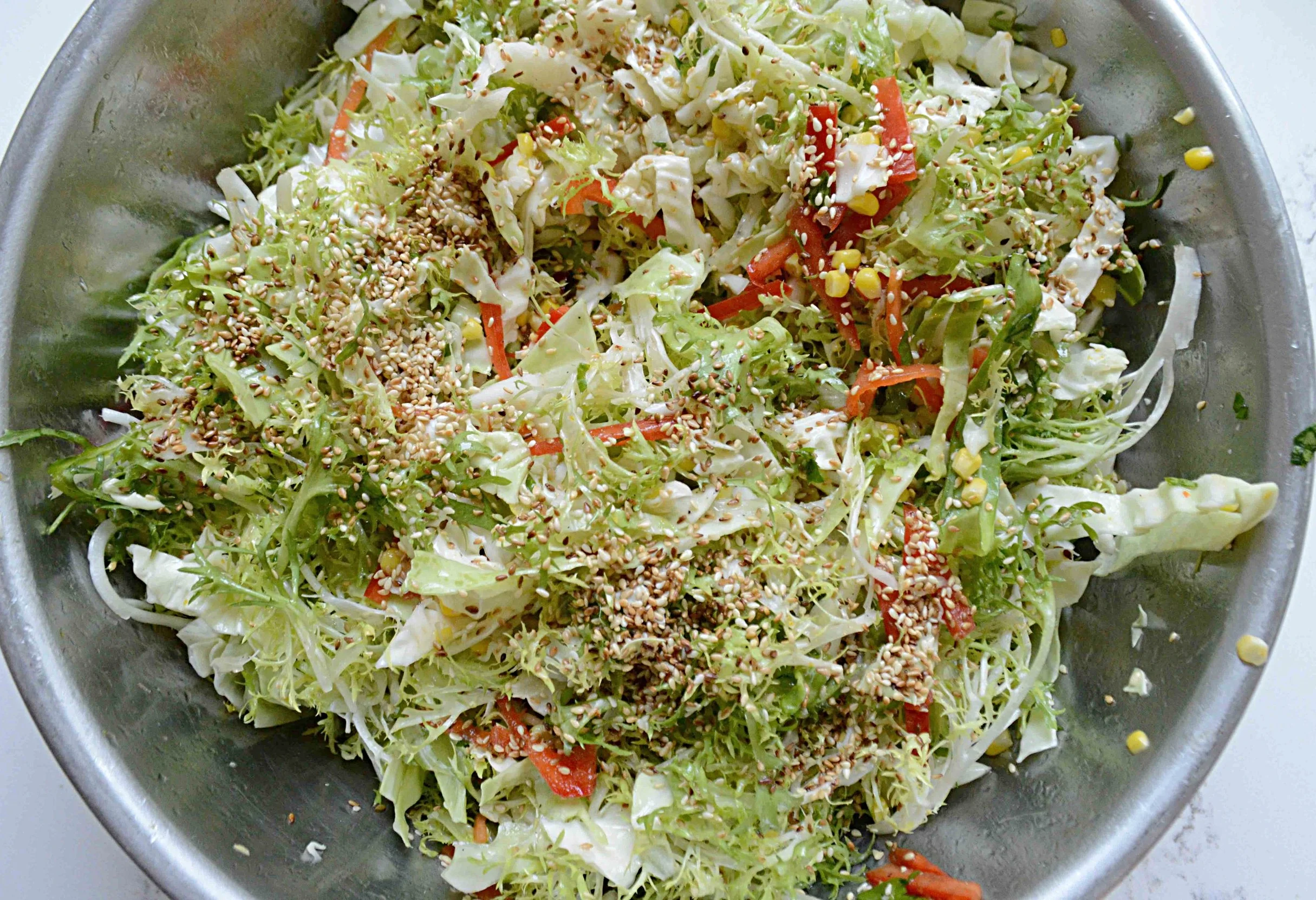 If you're looking for a way to spice up your next BBQ or picnic, this Summery Asian Slaw might just do the trick. Filled with crunchy cabbage, sweet corn, crisp red peppers, frisée and toasted sesame seeds all coated in a zesty citrus vinaigrette, it's definitely out of the ordinary and will add color and taste to whatever you serve!