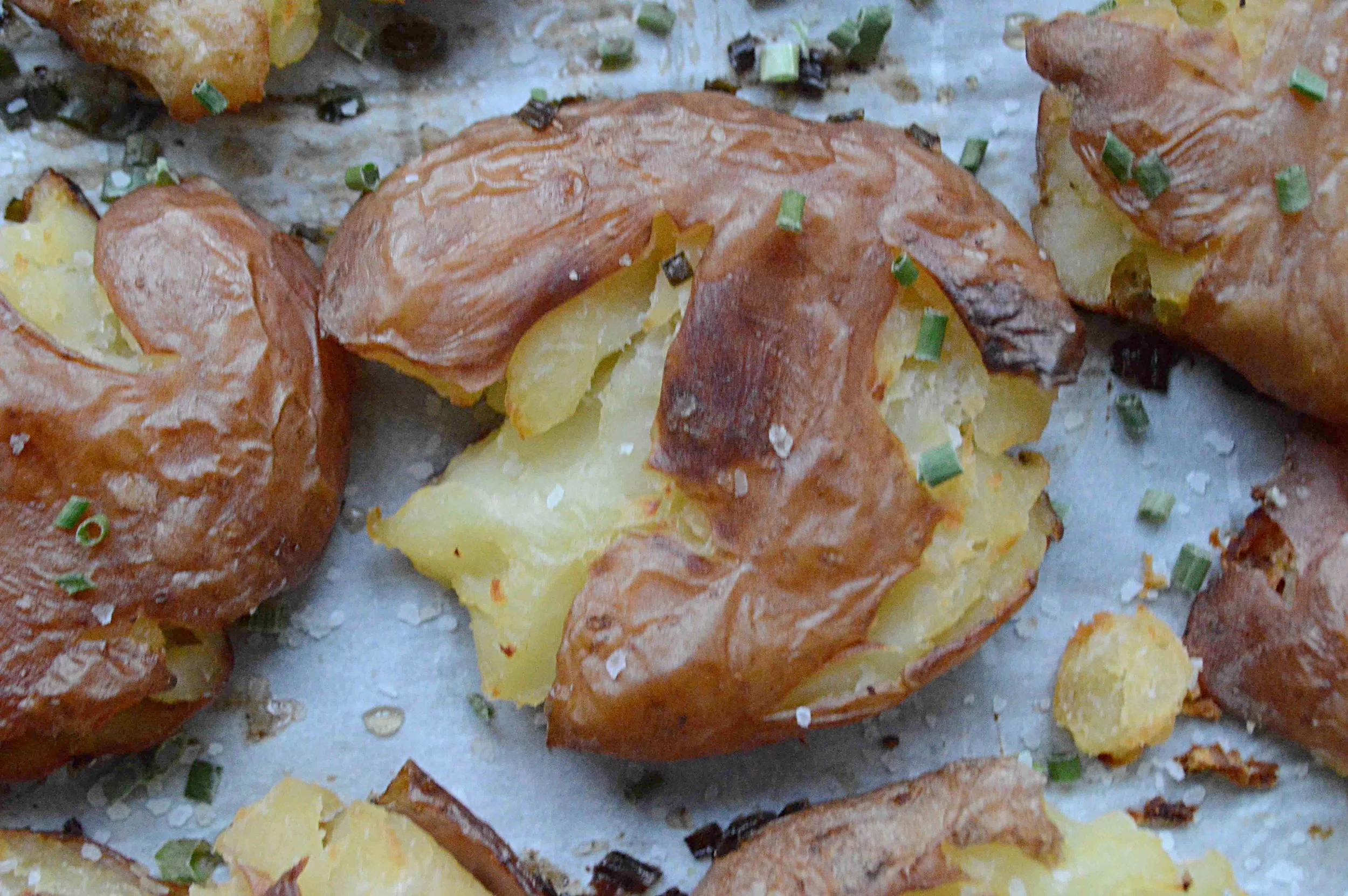 And they're really not all that more difficult to make than simple roast potatoes. After a boil in malt vinegar-infused water, you simply place them on a baking sheet, flatten or "smash" with the heel of your hand, brush with a simple butter, chive and malt vinegar mixture and some salt and pepper and bake. Believe me, the extra bit of effort is so, so worth it and there's no potato peeling involved! Happy!