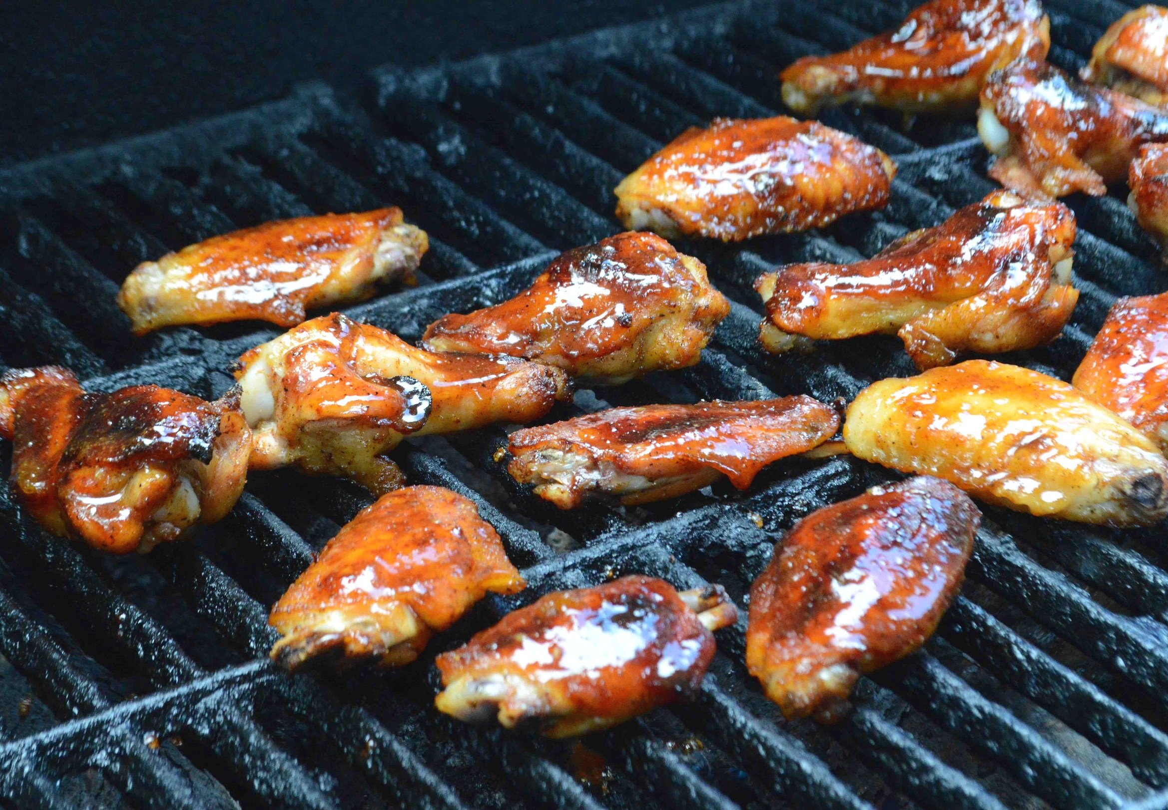4. If you are doing these entirely inside, bake wings first and remove them from the oven. Turn on the broiler. Baste wings and cook under broiler for a minutes (not too close or they’ll just burn up) and then remove, turn the wings over and baste the bottoms. Return to the oven and broil another minute, repeating the basting and turning process a few times until wings have some blackened spots on them. Garnish with scallions if using and serve immediately.