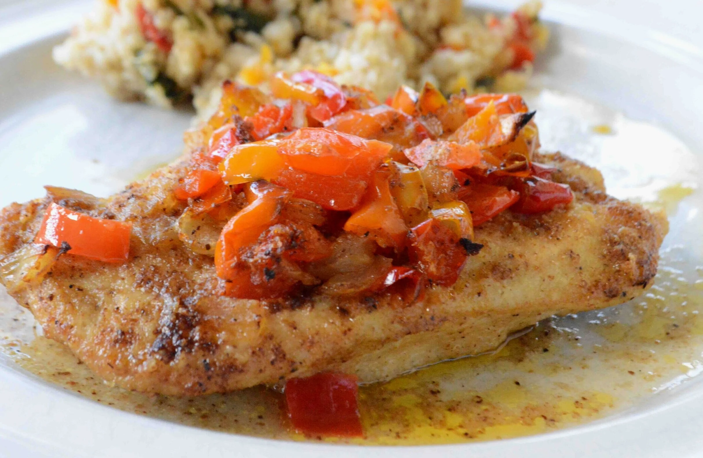 4. When all of the cutlets have been browned and transferred to the dish, add 2 tablespoons more oil to the pan and then the peppers and onion, along with a pinch or two of salt and pepper. Let cook for about 10 minutes, until tender, stirring often—you may need to lower the heat a bit if they seem to be getting brown too quickly. Now pour in the chicken stock and cook for another 5-7 minutes to let the stock reduce a bit. Then, pour the entire mixture over the cutlets in the baking dish and pop the whole thing into the oven for about 40-45 minutes, until the chicken is entirely cooked through and tender and pepper mixture is starting to caramelize a bit. Serve immediately with something good and starchy to sop up al the sauce.