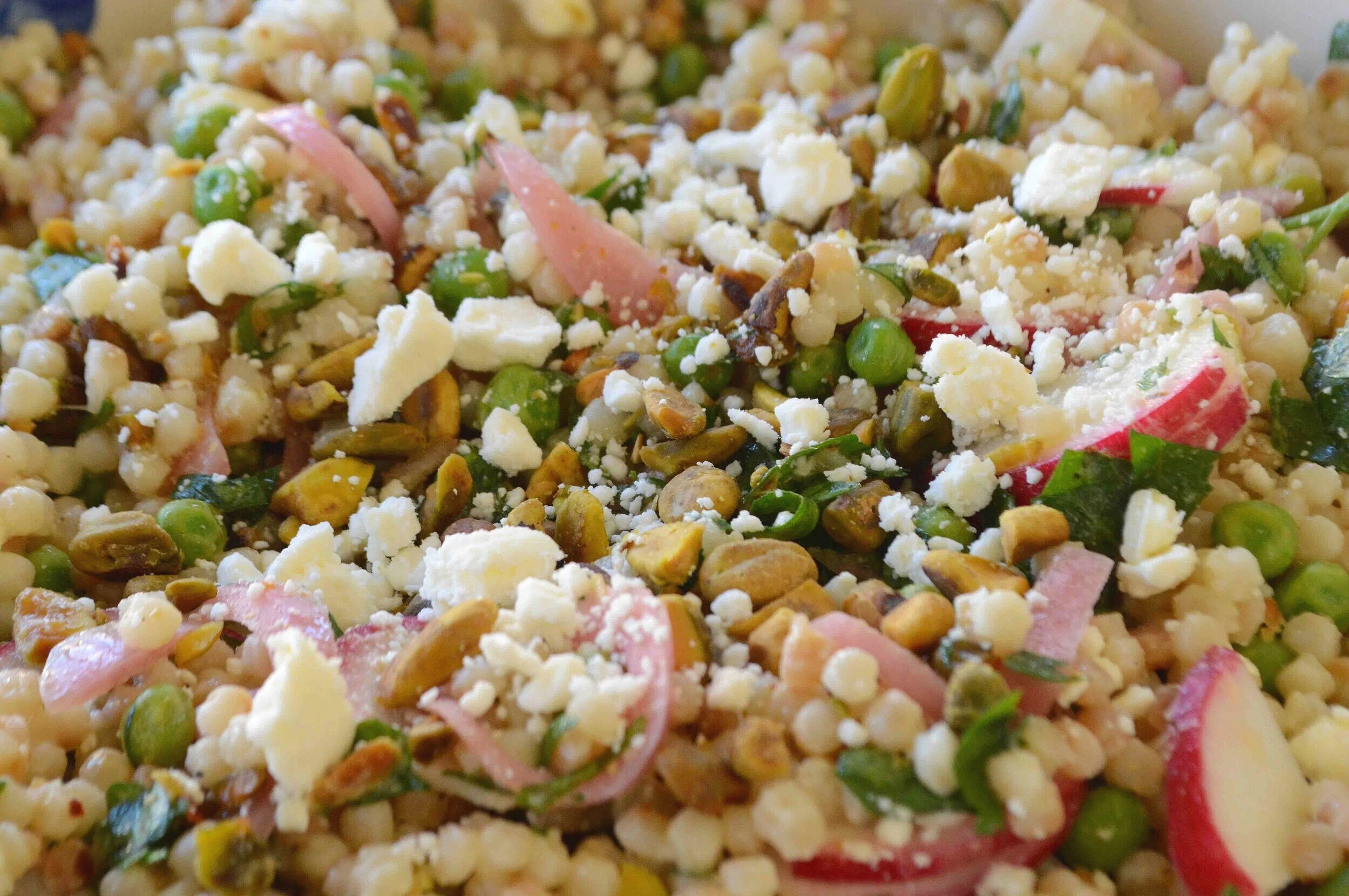 Israeli Couscous Salad with Pickled Onions, Peas, Pistachios and Feta