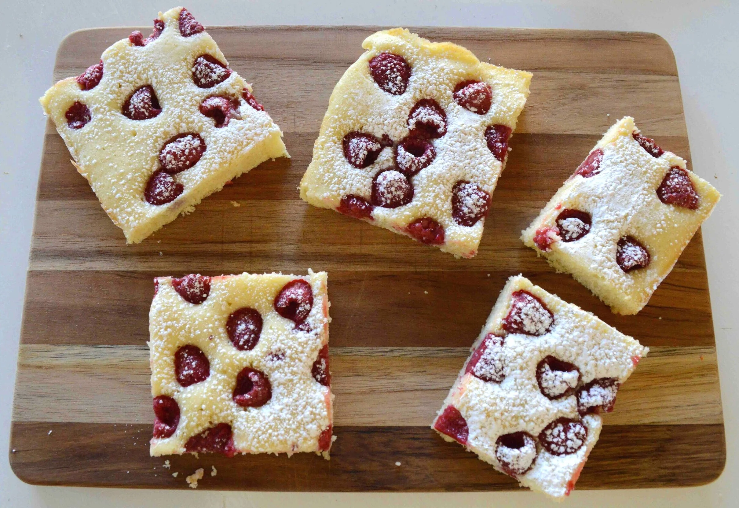 4. Pour the batter into the prepared pan and spread it evenly, paying attention to the corners. Scatter the berries all across it, gently pressing them into the batter. Bake the cake for 20-25 minutes until a tester inserted into the center comes out completely clean. Cool completely in the pan on a wire rack, for at least 1 hour. Just before serving, pour a little confectioners’ sugar into a small strainer and dust the entire cake. Cut into squares and serve.