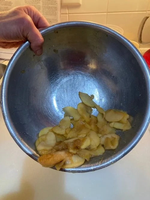 Heat 2 tbsp of the butter in a large skillet on medium heat. When melted and foaming, turn off the heat and carefully add the apple mixture (especially if you added alcohol). Turn the heat back on to medium and cook the mixture, stirring occasionally, until apples are tender and liquid has evaporated (15-20 minutes). Return the apple mixture to the bowl and leave to cool completely. (The bowl can also sit in some cold water to bring the temperature down).