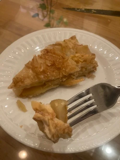 I’m feeling a little bolder about trying new things so I’ve taken a swing at a New York Times recipe from Nicola Lamb for “Pastis Gascon”, the french cousin of apple pie. The “crust” for this pie is built from phyllo pastry sheets and generous amounts of butter. These sheets are paper thin and must be handled delicately but they end up being an ingredient that brings a unique and satisfying touch to this desert.