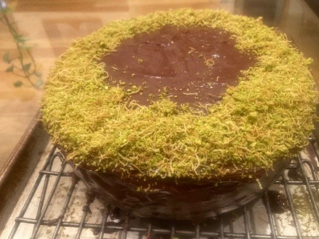 Prep Time: Cake (20 minutes); Pistachio/Kataifi Filling (30 minutes); Ganache (30 minutes); Bake Time (35 -45 minutes); Ganache Finish (30 minutes)