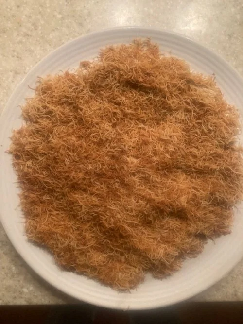 The kataifi is spread around a saucepan and heated with melted butter until browned and crunchy.